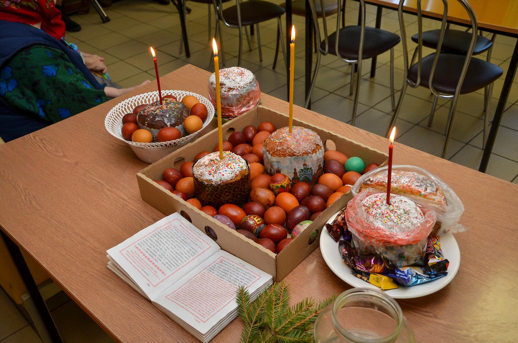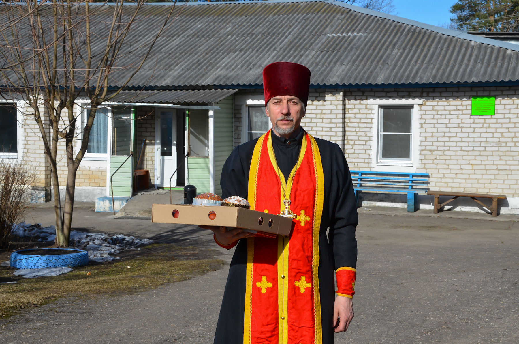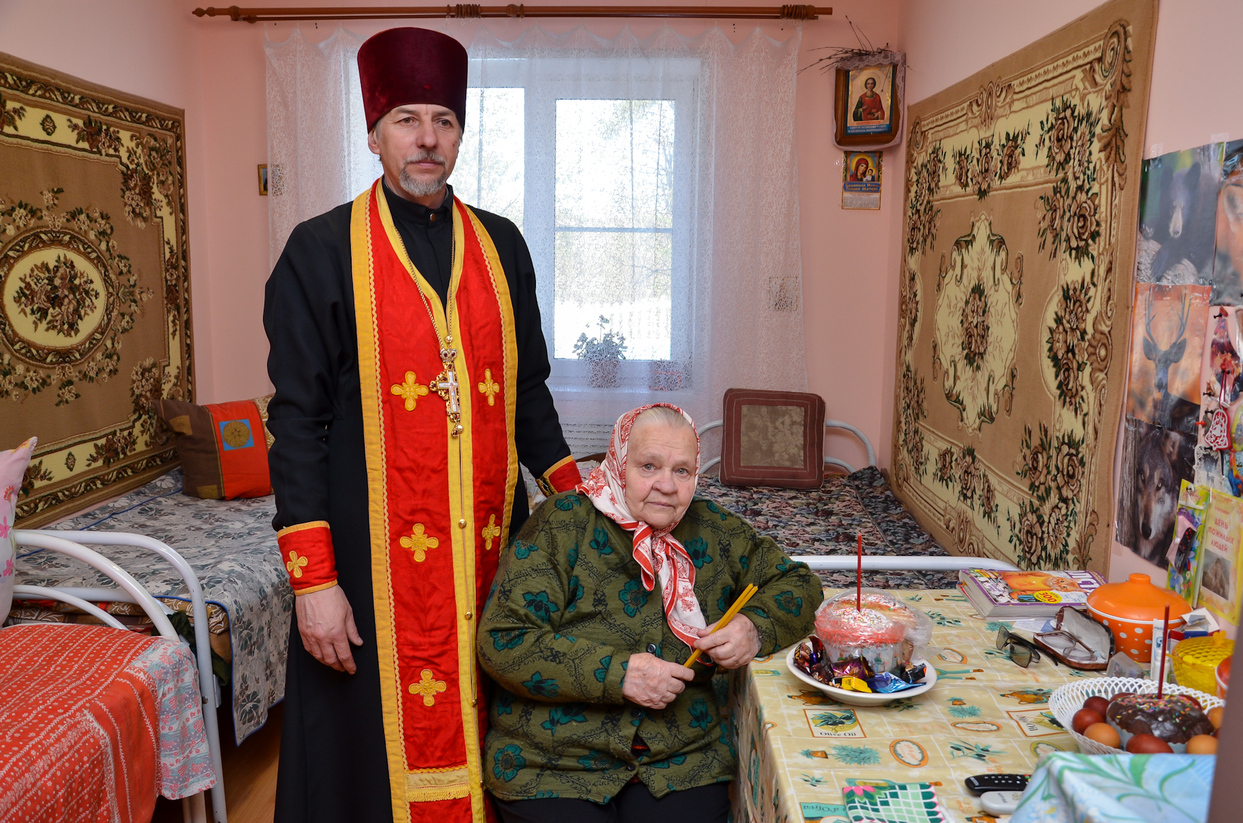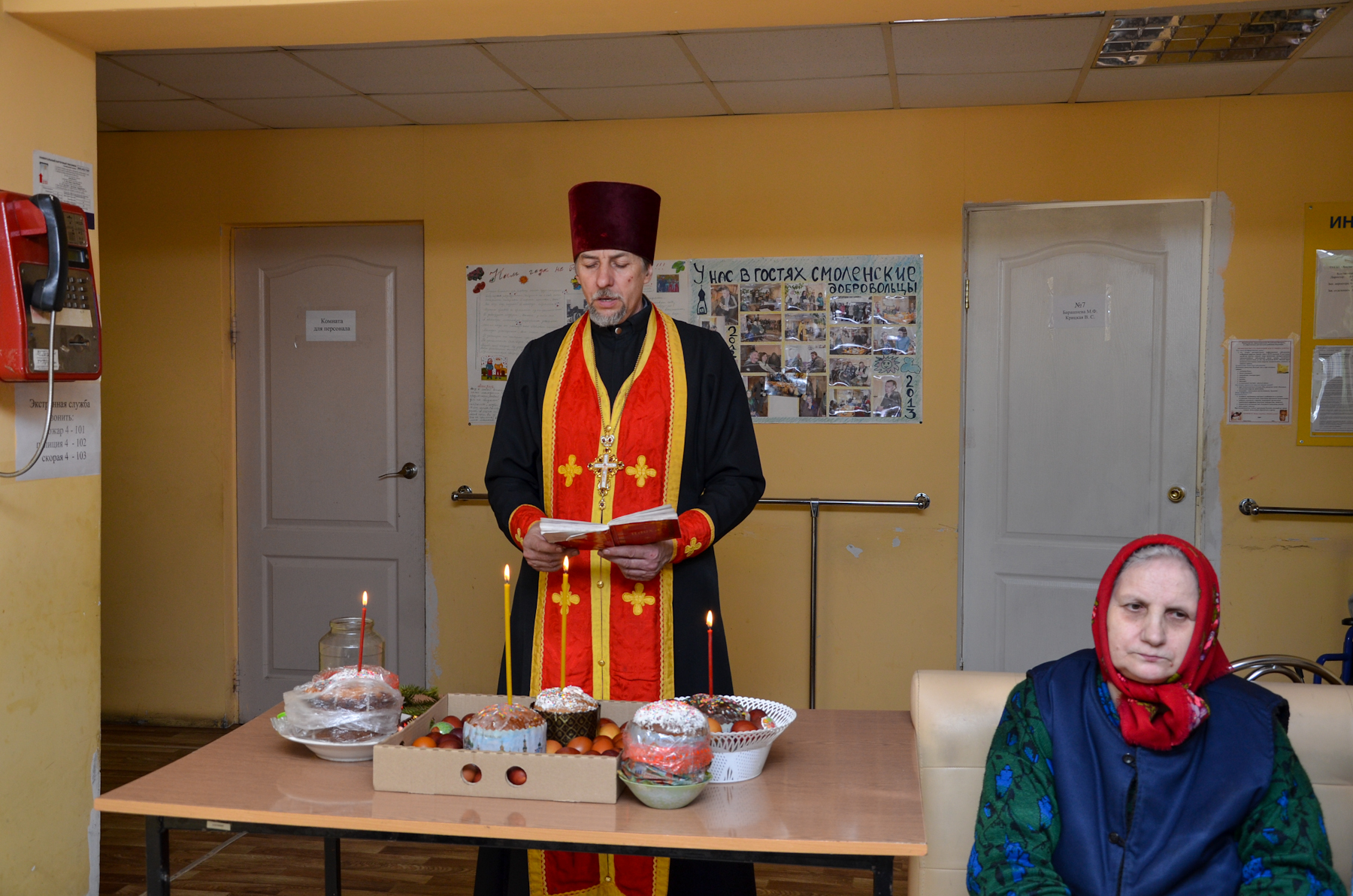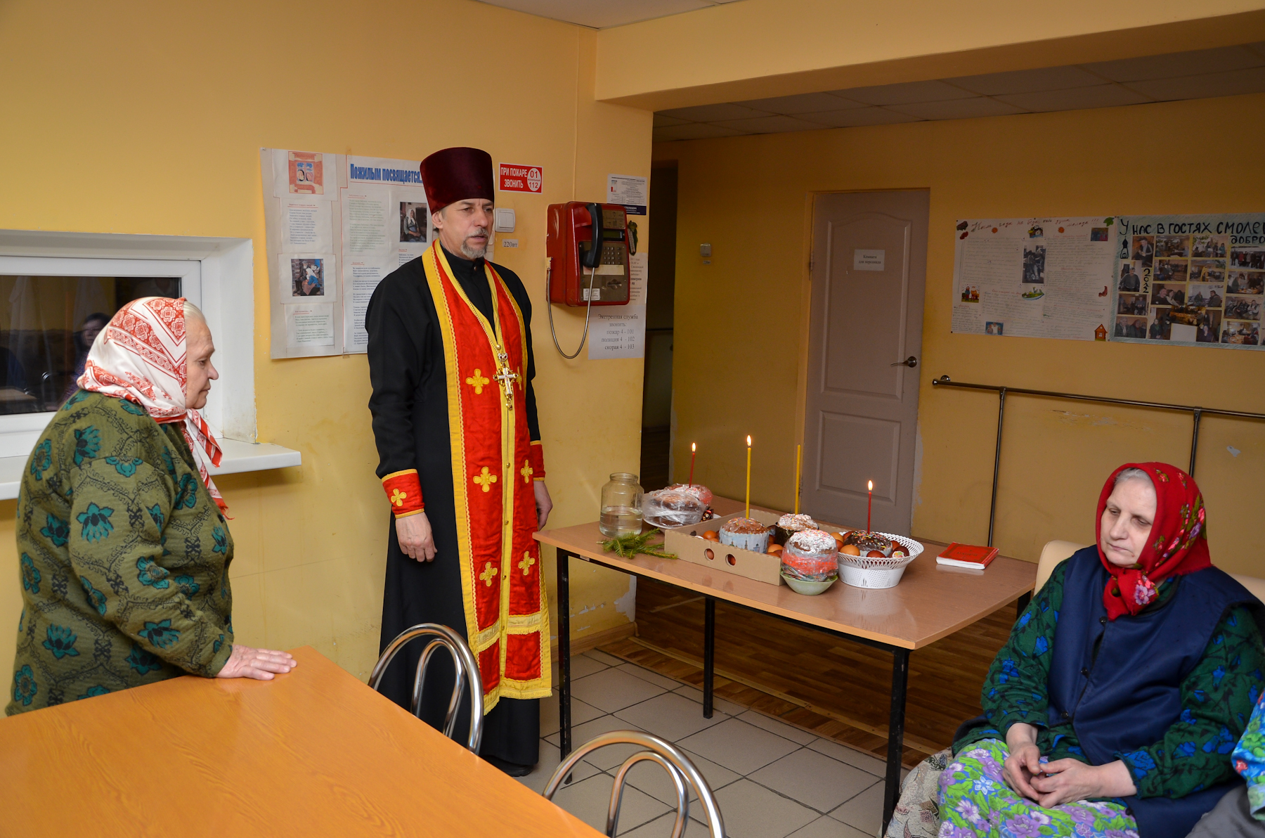 Отец благочинный помолился за праздничным молебном, освятил пасхальные яства, поздравил его жителей и персонал с Пасхой Христовой.