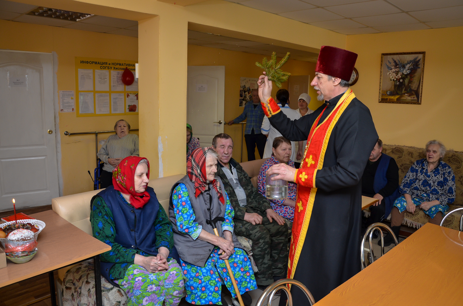 8 апреля 2018 года, в праздник Светлого Христова Воскресения, благочинный церквей Хиславичского округа протоиерей Роман Свистун посетил Отделение стационарного социального обслуживания граждан пожилого возраста и инвалидов СОГБУ «Хиславичский КЦСОН» в деревне Городище Хиславичского района.