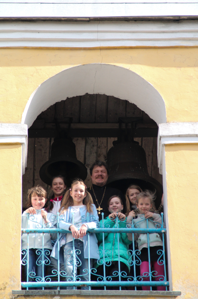 После традиционного катания яиц дети с батюшкой поднялись на колокольню, где каждый ребенок колокольным звоном смог возвестить пасхальную радость родному посёлку.