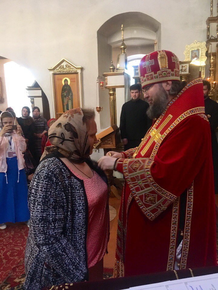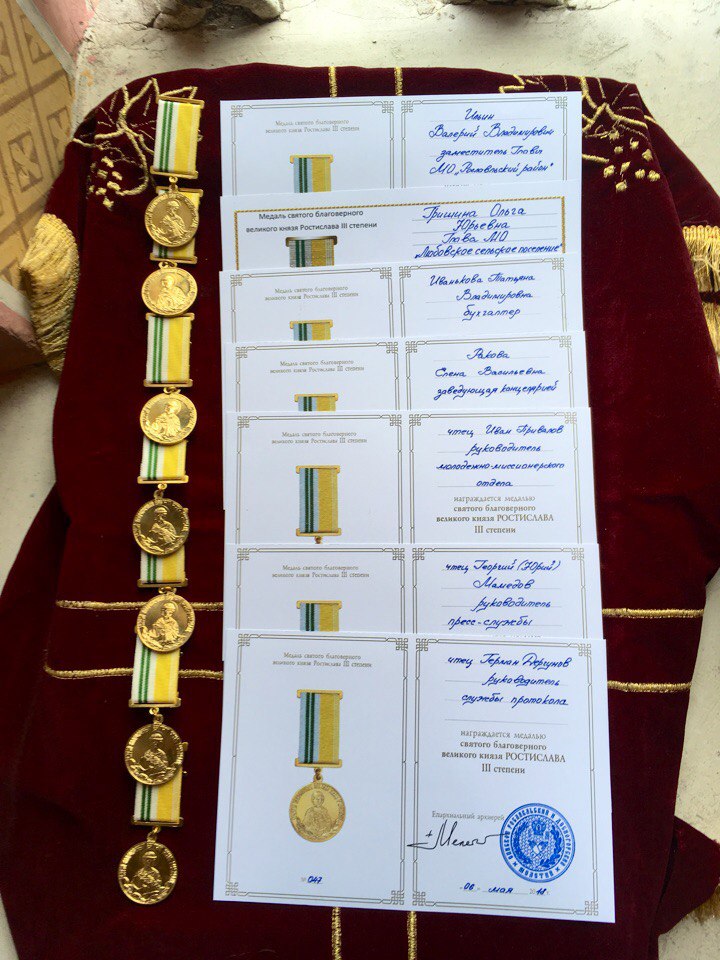 По окончании Богослужения епископ Мелетий возглавил праздничный крестный ход, после которого Его Преосвященство наградил медалью Святого Благоверного князя Ростислава III степени Первого Заместителя Главы муниципального образования «Рославльский район» Смоленской области Ильина Валерия Владимировича, Главу МО «Любовское сельское поселение» Гришину Ольгу Юрьевну , Бухгалтера епархии Иванькову Татьяну Владимировну, заведующую канцелярией Ракову Елену Васильевну, руководителя молодежно-миссионерского отдела чтеца Ивана Привалова, руководителя пресс-службы епархии чтеца Георгия (Юрия) Мамедова, а также руководителя службы протокола чтеца Германа Дергунова.