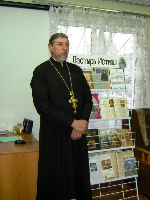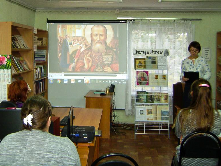 Вниманию слушателей был представлен видео-рассказ о «всероссийском батюшке» Иоанне Кронштадтском — простом приходском священнике, взявшем на себя крестный подвиг исповедника Христова в предгрозовые для Русской земли годы. Рассказывая о судьбе святого, сотрудник Центральной библиотеки Людмила Антощенкова обратила внимание присутствующих на время, в которое ему суждено было родиться — время сильного оскудения веры, как у простых людей, так и в среде интеллигенции и высшего общества. Иоанн Кронштадтский с его духовными дарованиями и пламенной верой был призван всколыхнуть народ, возжечь в нем веру в Творца и доверие к Церкви.