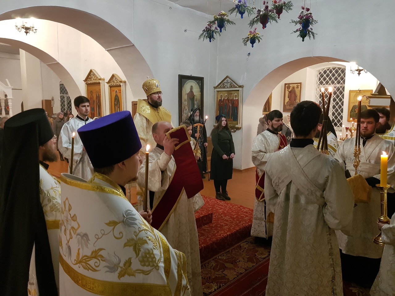 Его Преосвященству сослужили благочинный монастыря иеромонах Роман (Кулютин), иеромонах Боголеп (Пронин), древлехранитель епархии иерей Андрей Пудов, иерей Алексий Бочкарёв, секретарь епархии диакон Николай Бондар, эконом епархии диакон Андрей Бодякин, эконом монастыря диакон Димитрий Родин.