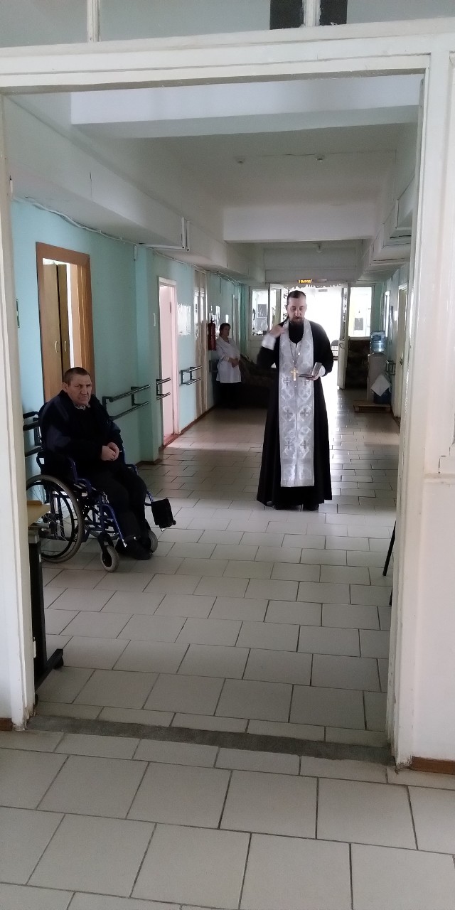 Был отслужен молебен о здравии проживающих и персонала. Затем иерей и диакон прошли по комнатам с поздравлениями и подарками. Большинство проживающих в Доме престарелых лежачие больные.