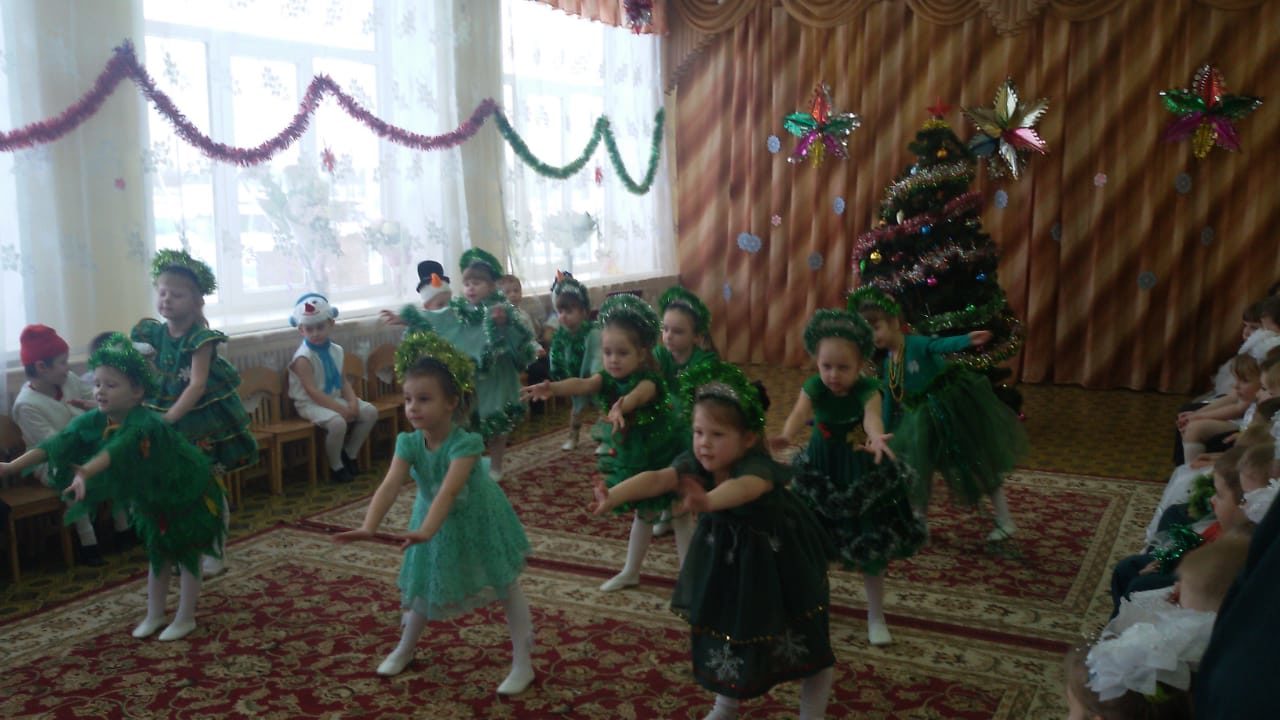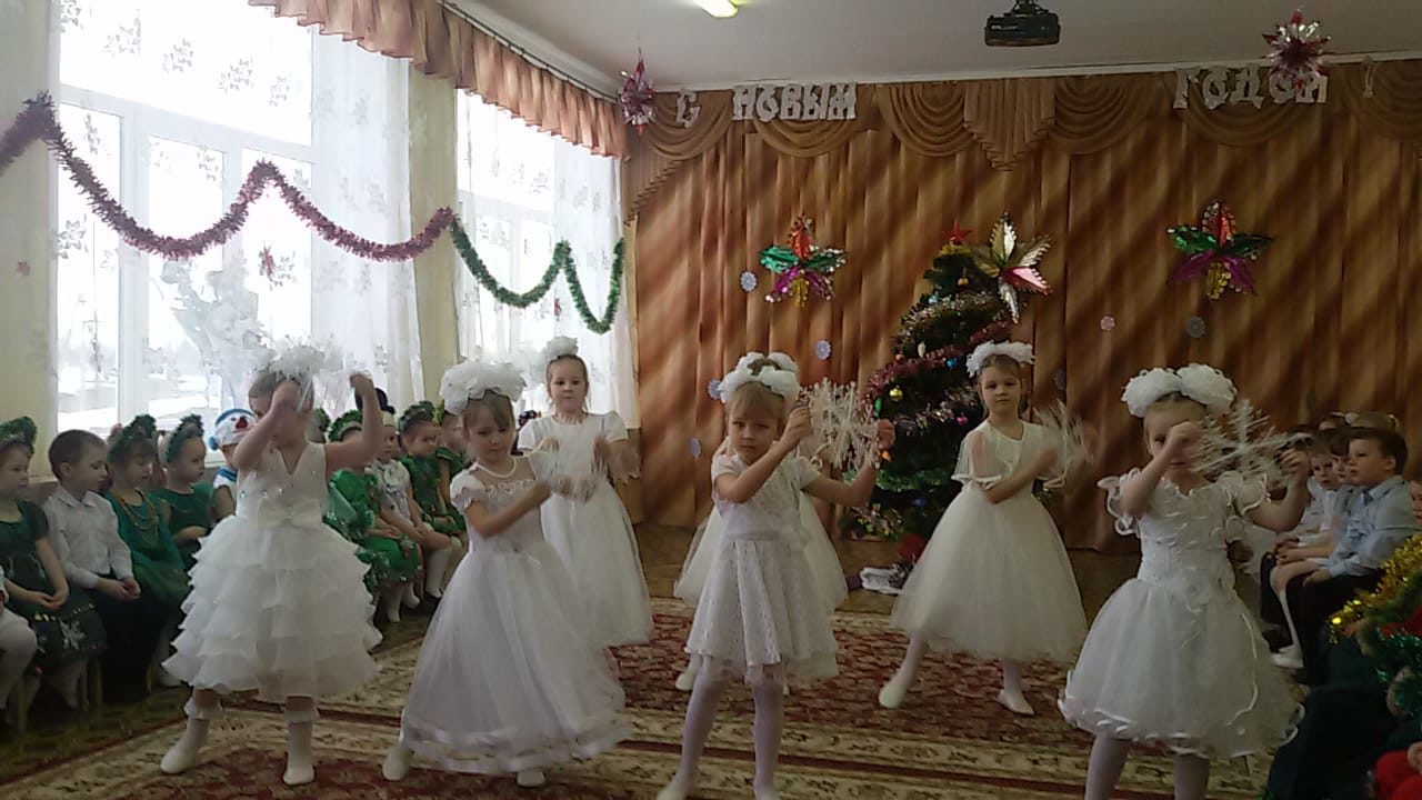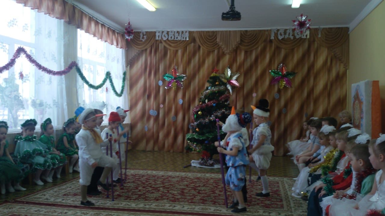 Воспитатели и дети приготовили свою праздничную и интересную программу. На сцене возле елки кружились нарядные снежинки, совершали танец сказочные снеговики, кружили хоровод наряднее маленькие елочки, вели у костра сказочный разговор двенадцать месяцев, порошила землю зимняя вьюга.