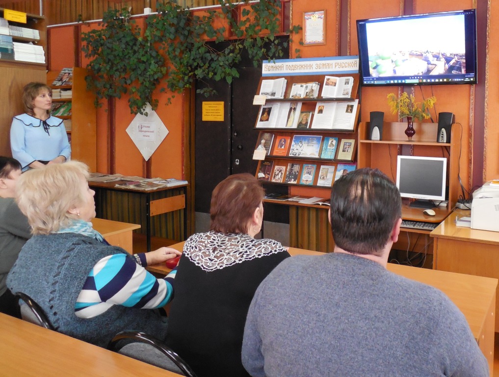 На презентацию книги Архиепископа Никона Рождественского «Житие и подвиги Сергия Радонежского» были приглашены жители поселка. Презентация была приурочена к 705 – летию со дня рождения святого. Библиотекарь Царева Е. В. рассказала гостям о земной жизни преподобного Сергия. О возникновении Троице – Сергеевой Лавры, самой почитаемой обители в наши дни. Рассказ сопровождался видеороликами и презентацией.