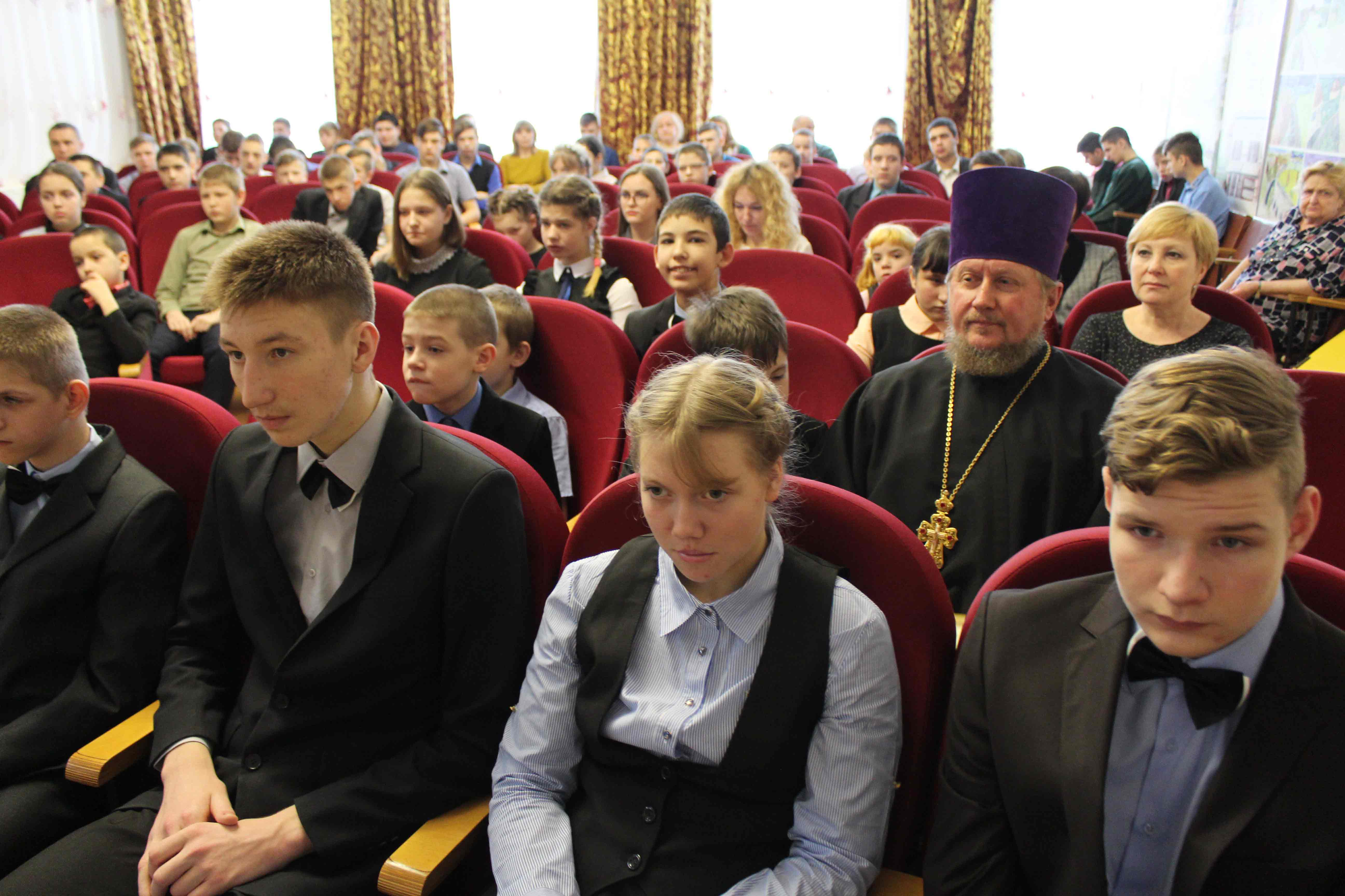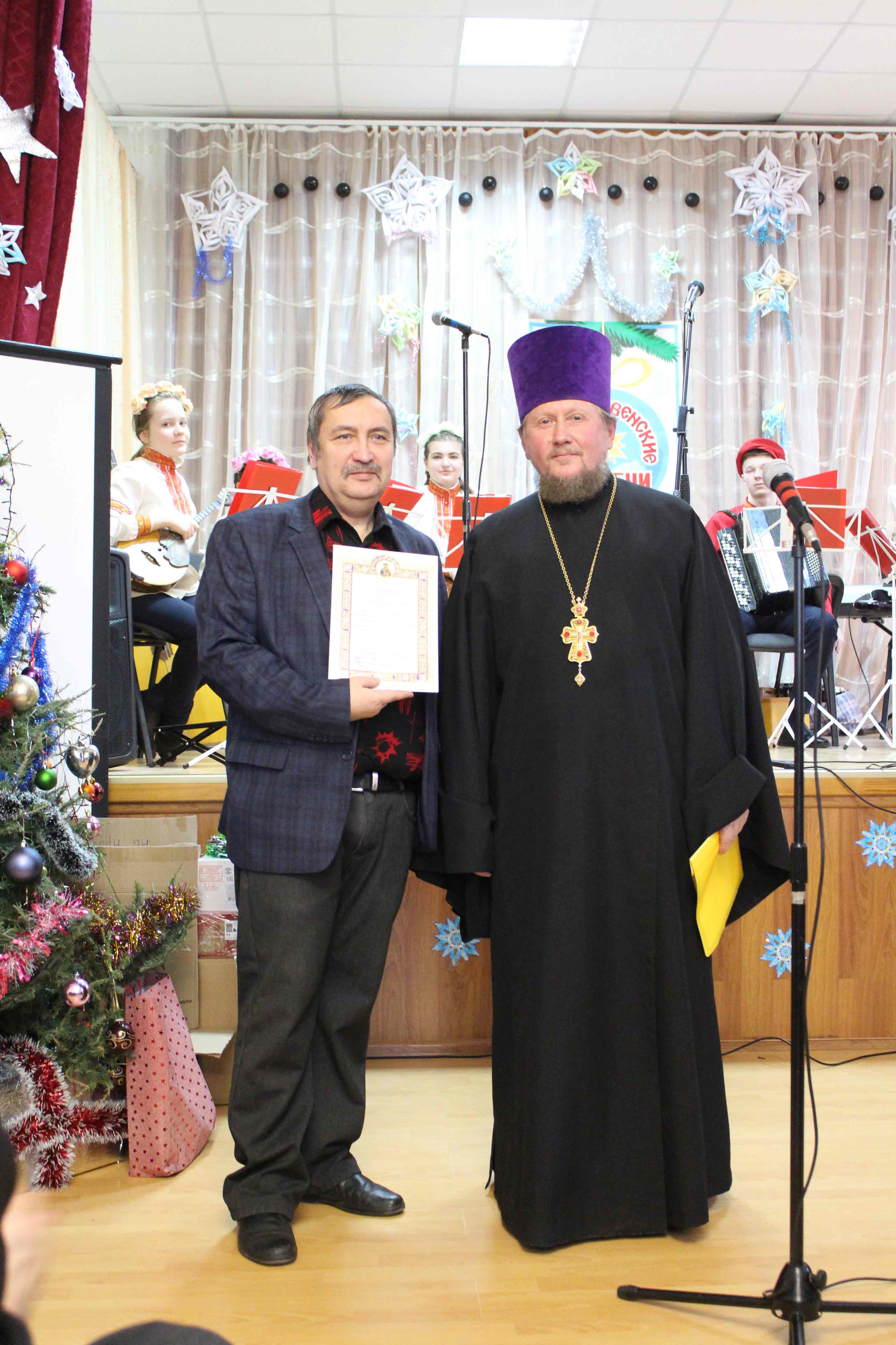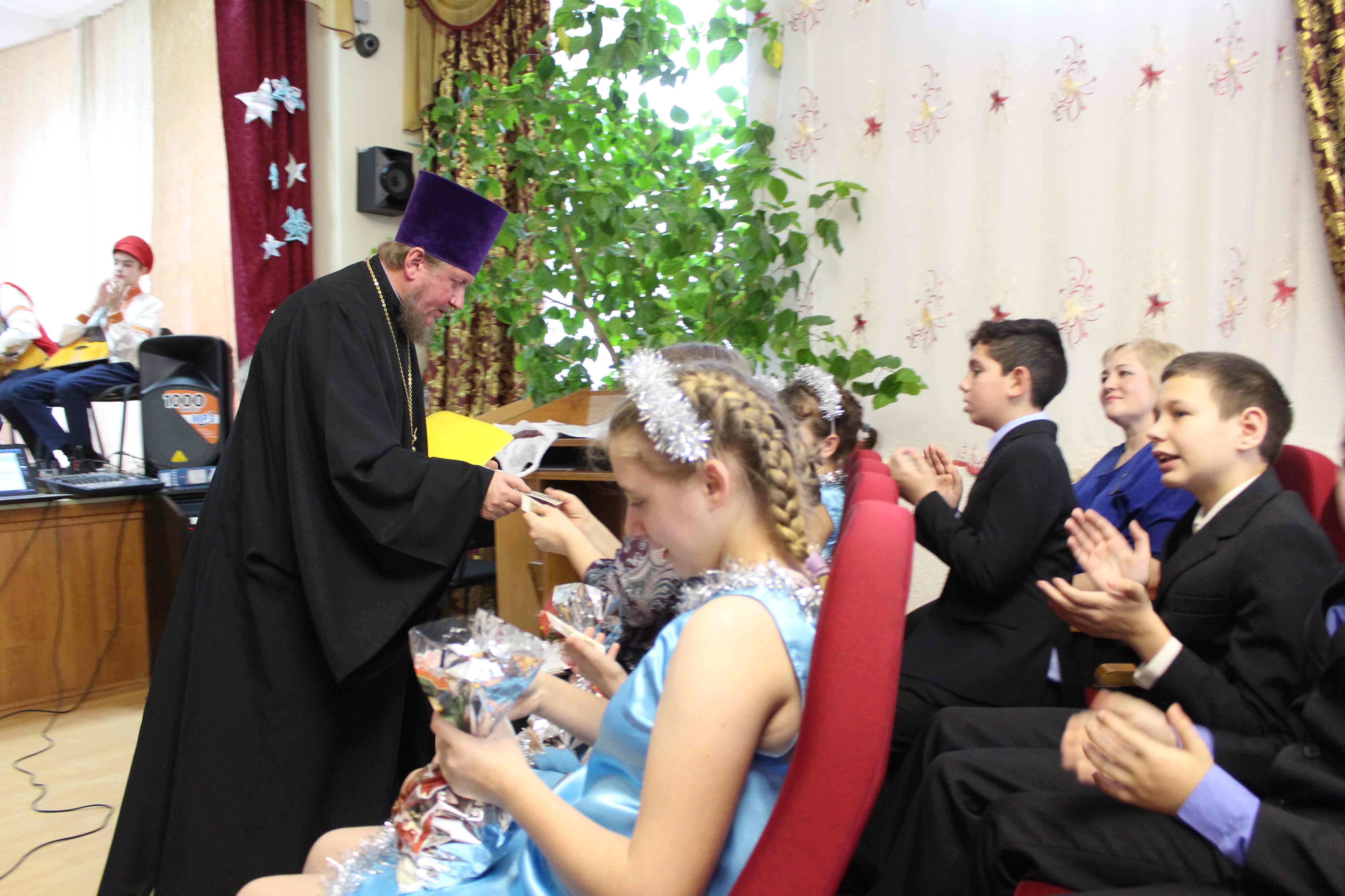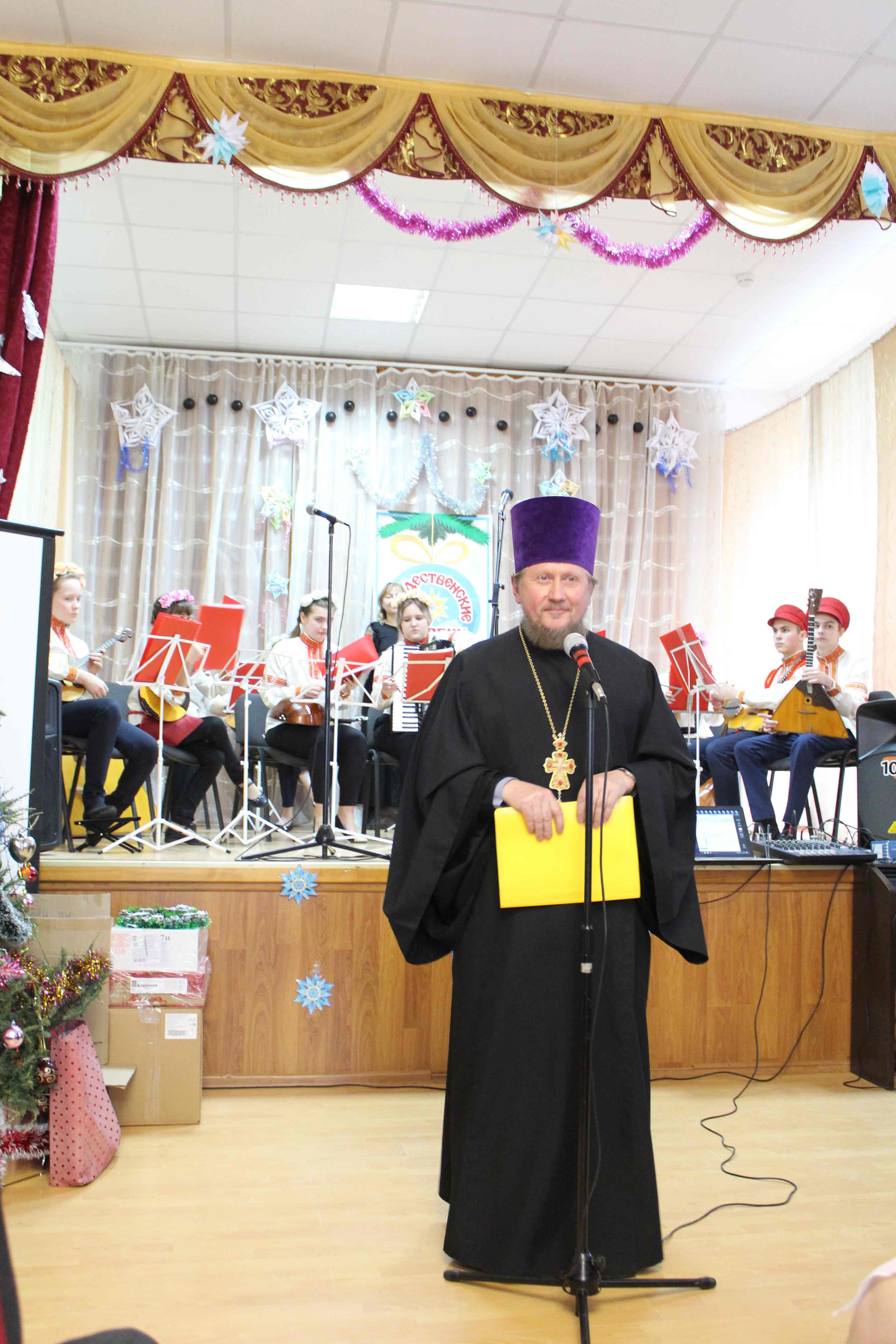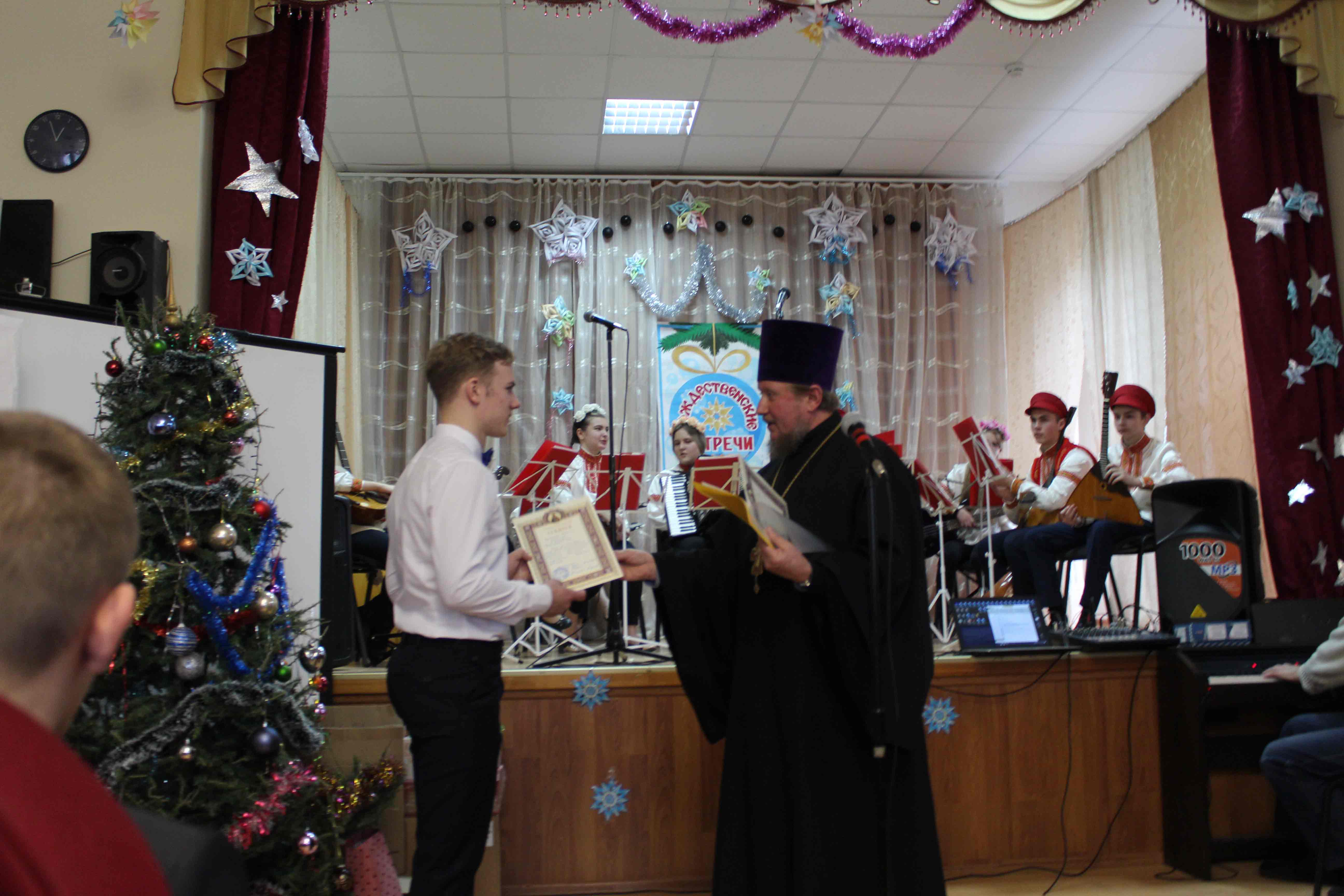 Почетный гость Рождественских встреч протоиерей Николай Бондар в завершении мероприятия рассказал детям о празднике Рождества Христова и о грядущем празднике Крещения Господня. Отец Николай и матушка Надежда поздравили всех колядками.