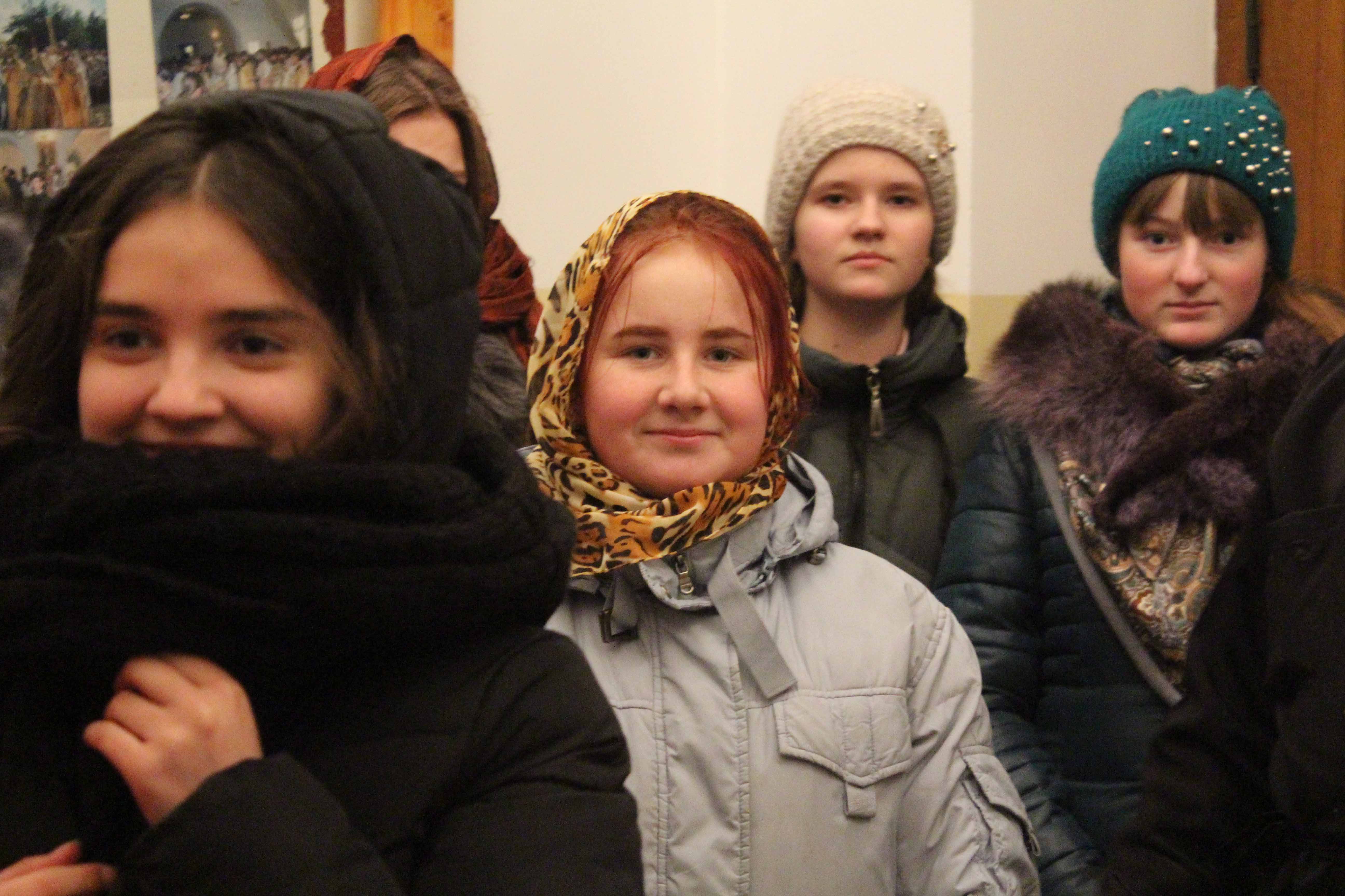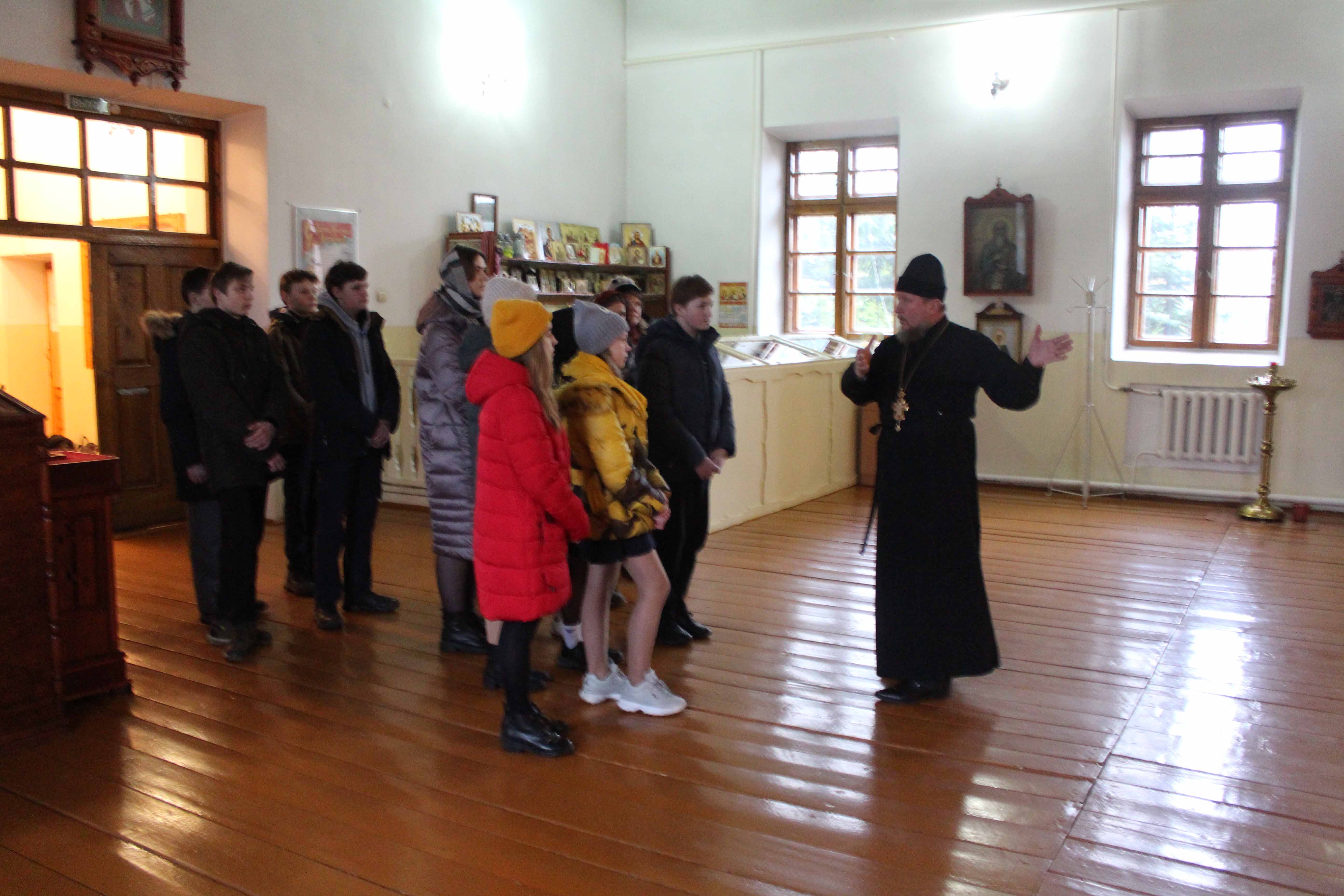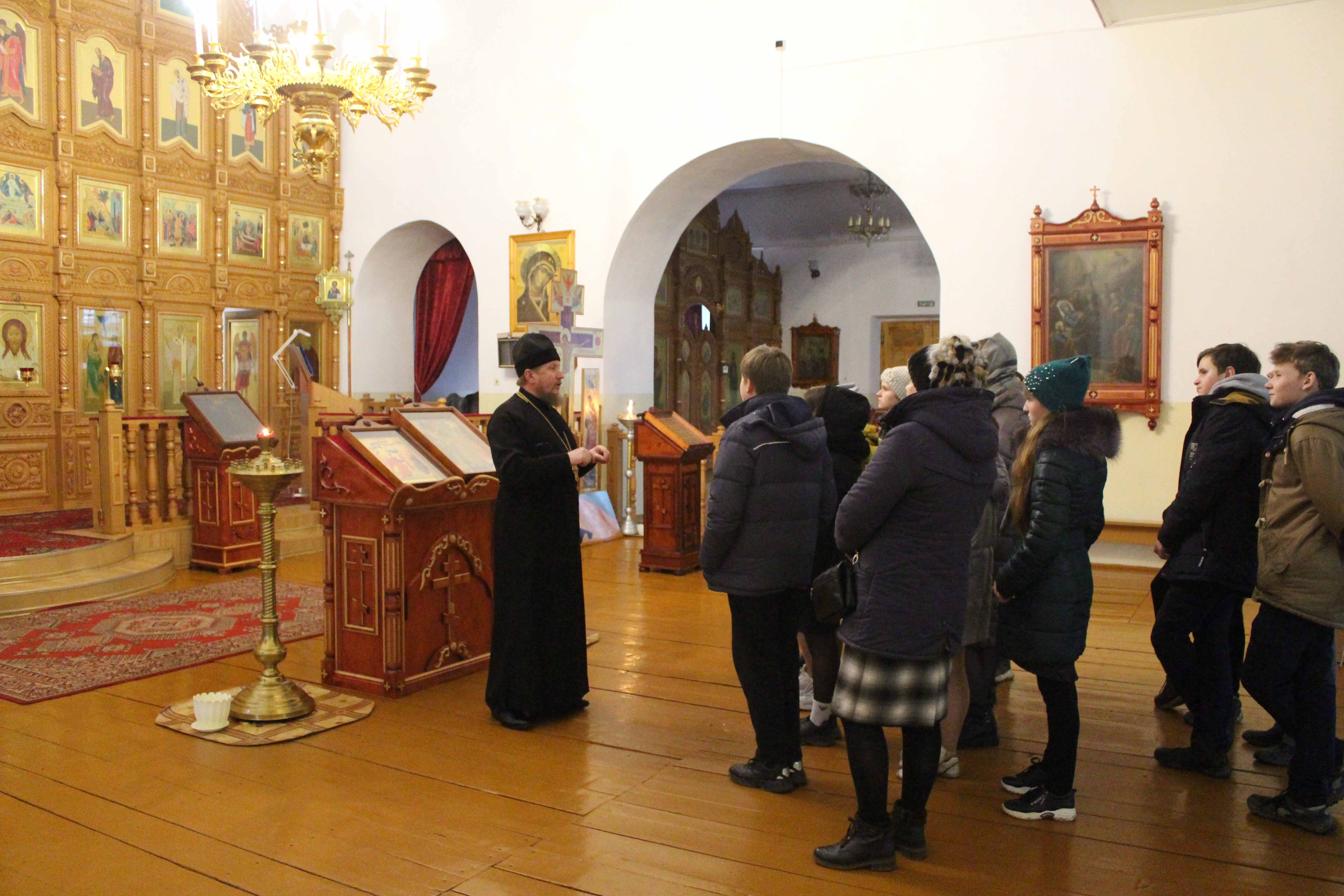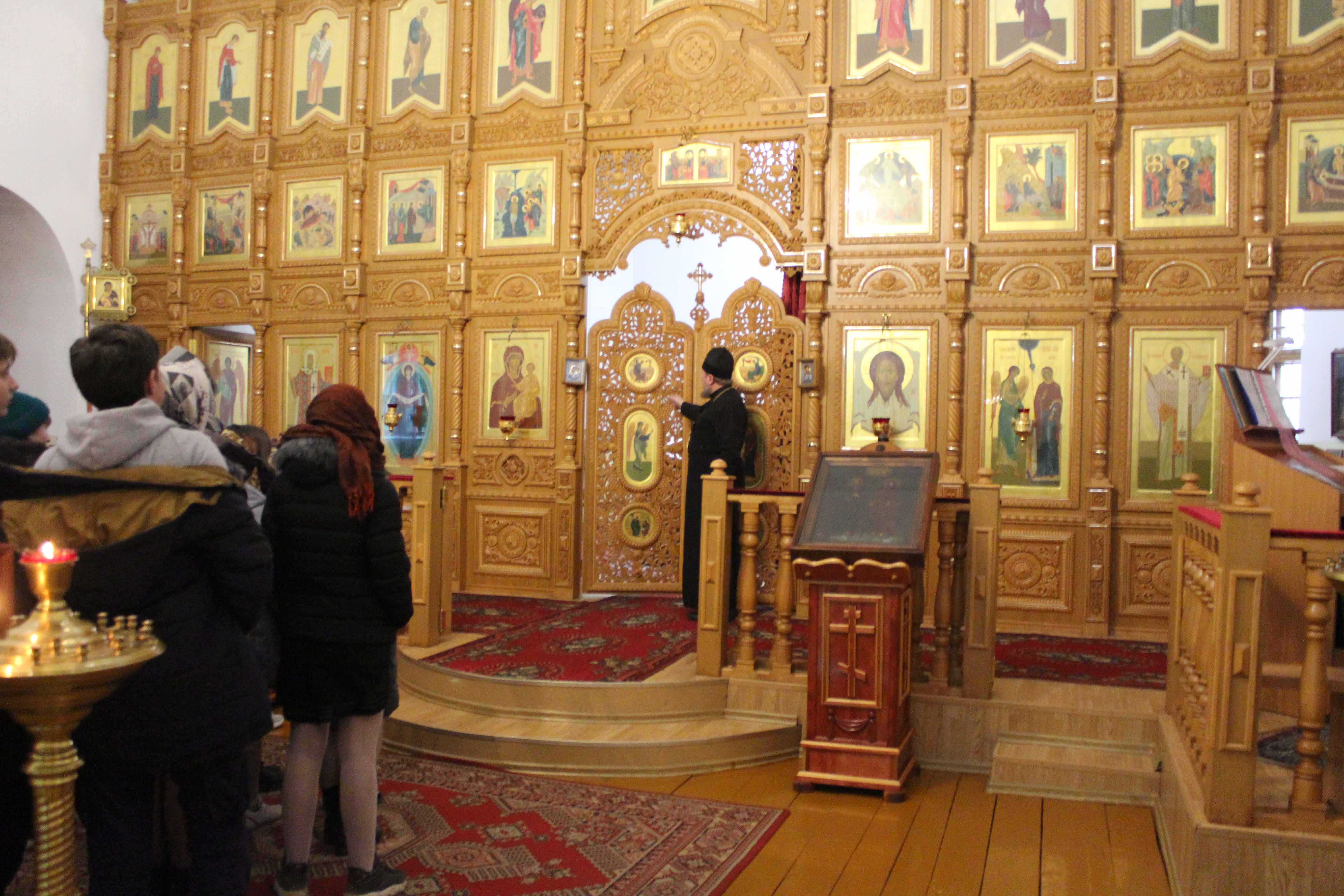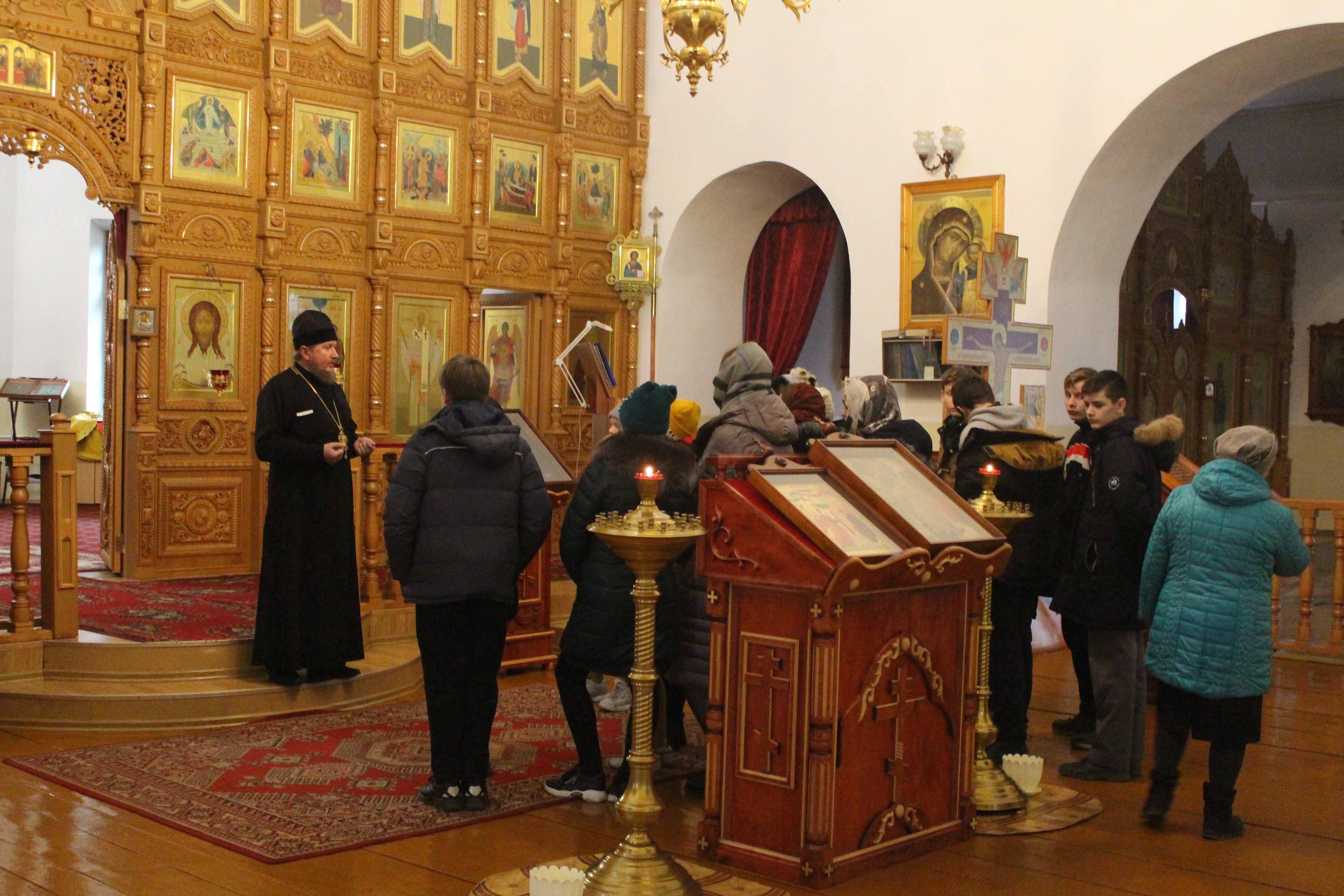Отец Николай рассказал детям о предназначении, устройстве и истории храма. Настоятель рассказал учащимся о подготовительных неделях к Великому Посту, в частности и о грядущем Прощеном воскресении. Отец Николай призвал детей, чтобы они учились прощать обиды родным, близким, друзьям, тогда и Бог простит наши прегрешения.