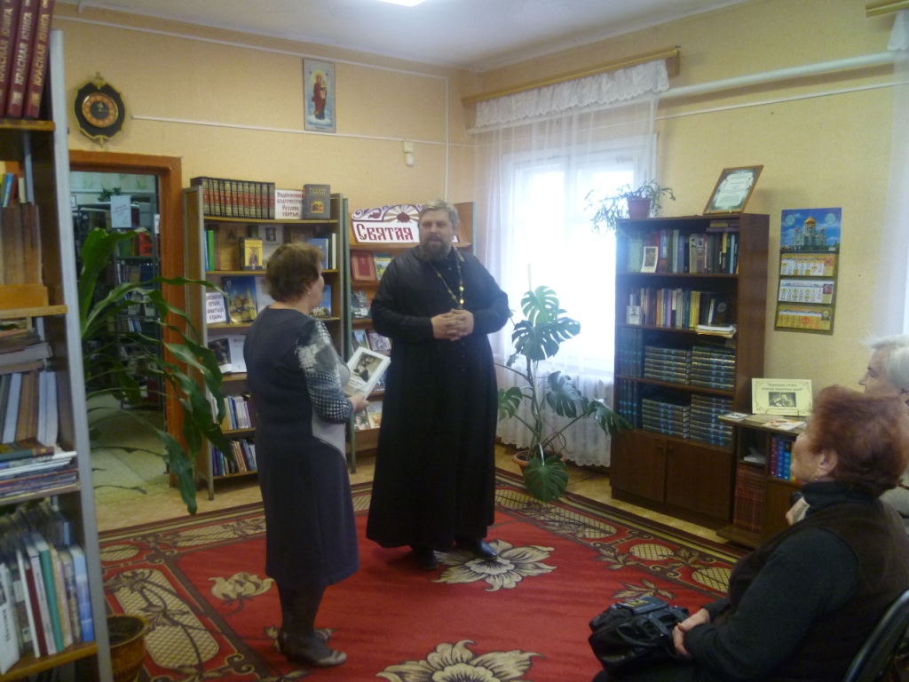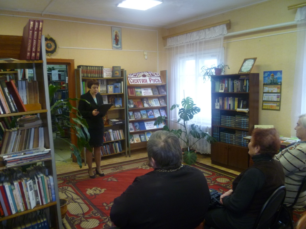 Мероприятие продолжилось в читальном зале библиотеки. В.А. Станкевич, заслуженный учитель РФ , преподаватель «Основ православной культуры» рассказала о православных писателях и православных книгах. Участники мероприятия заинтересовались книгой В.А. Станкевич «Звон колокольный летит сквозь столетия». В книге описан опыт паломнических поездок В.А. Станкевич со своими учениками.