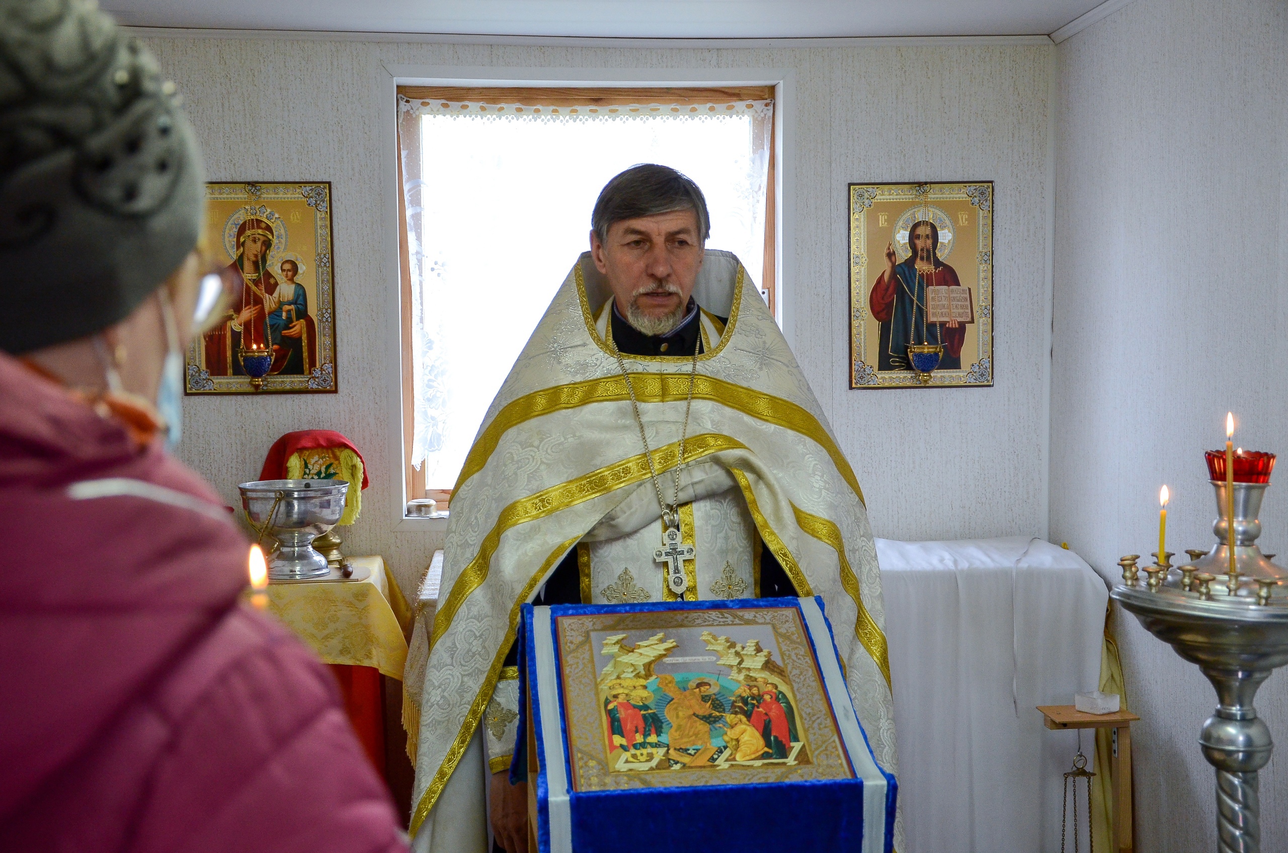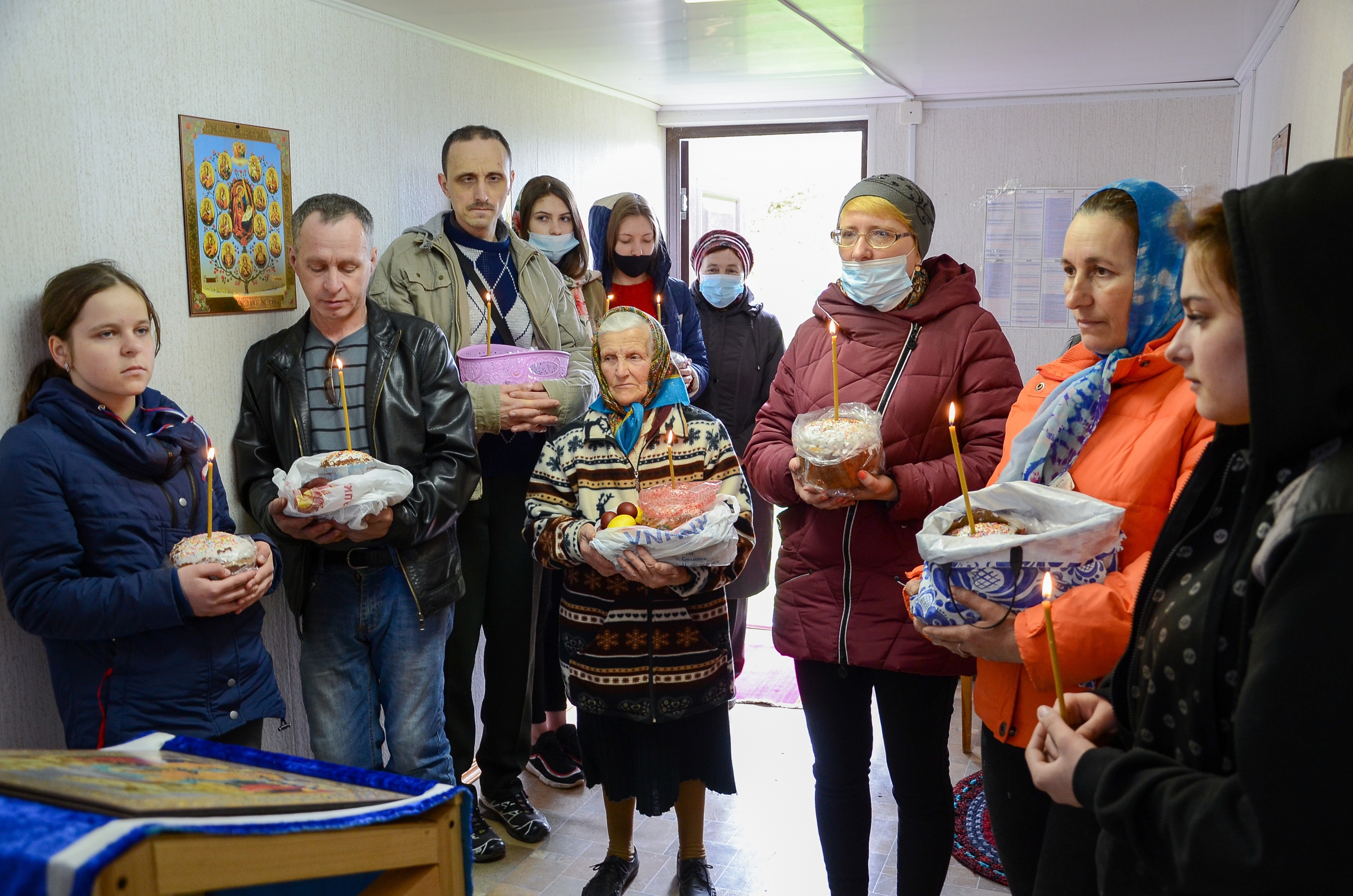 Во временном храме Покрова Пресвятой Богородицы отец Роман освятил куличи, пасхи и крашеные яйца и поздравил верующих с наступлением Пасхи Господней.
