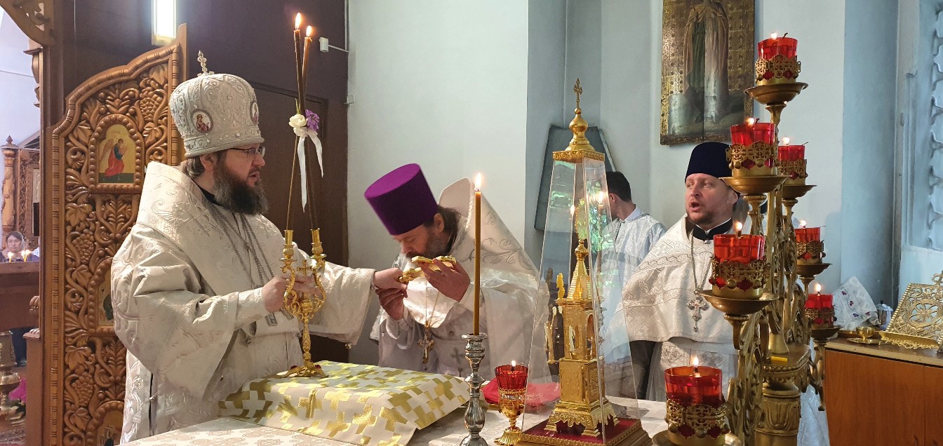 После сугубой ектении Преосвященный Мелетий вознес молитвы о мире на Украине и об избавлении от коронавируса.