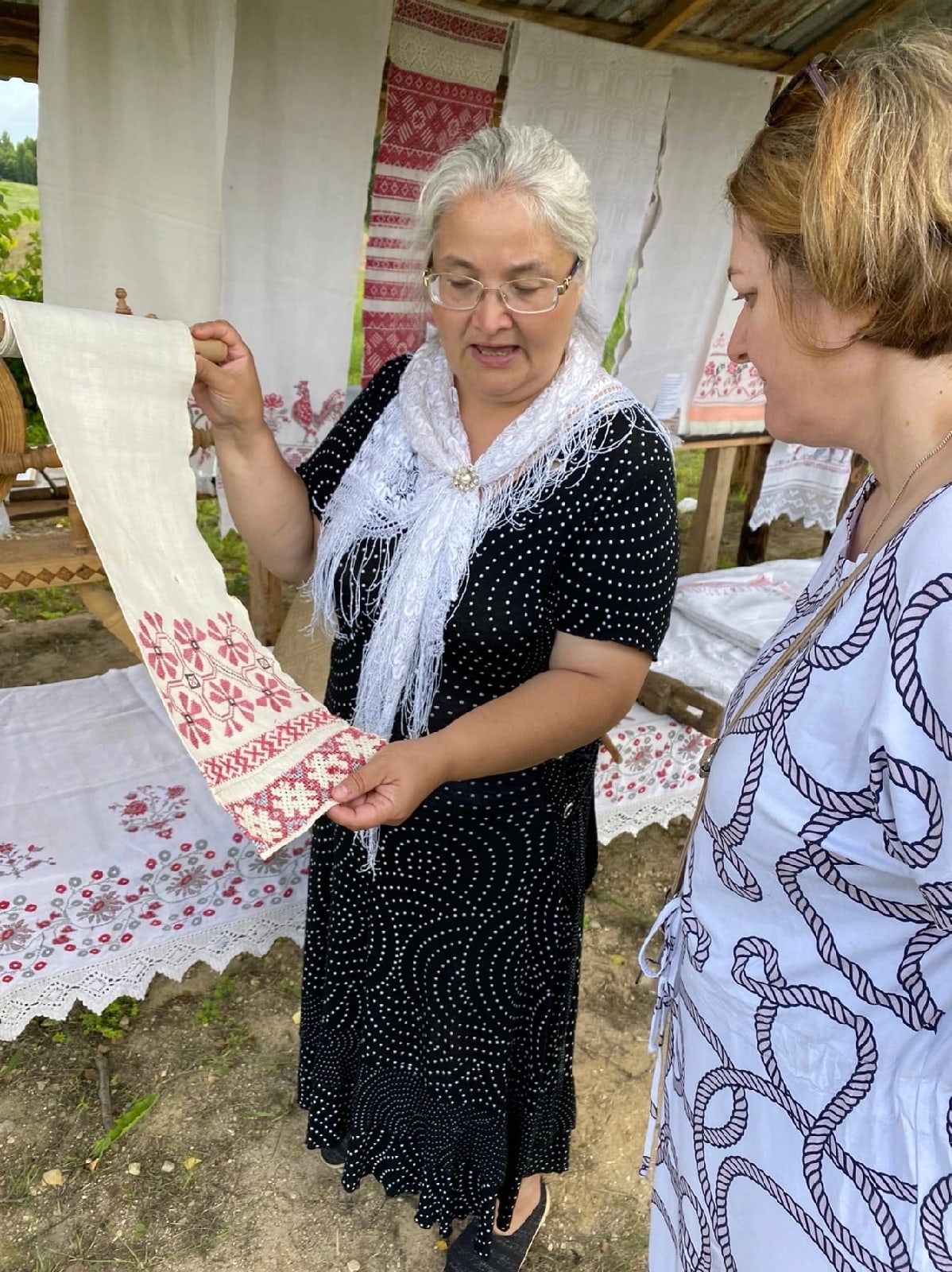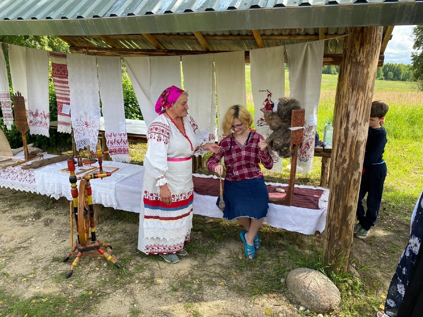 В недавно построенной беседке была организована выставка декоративно — прикладного искусства из коллекции матушки Любови Никитенковой. Мастер — класс по изготовлению нити для прядения провела Лариса Голуб.