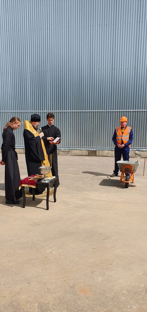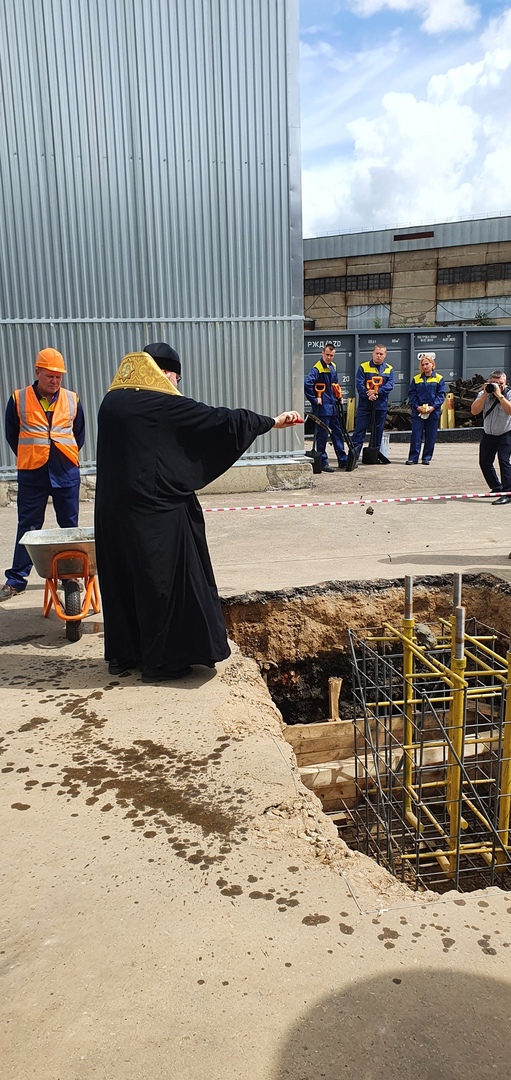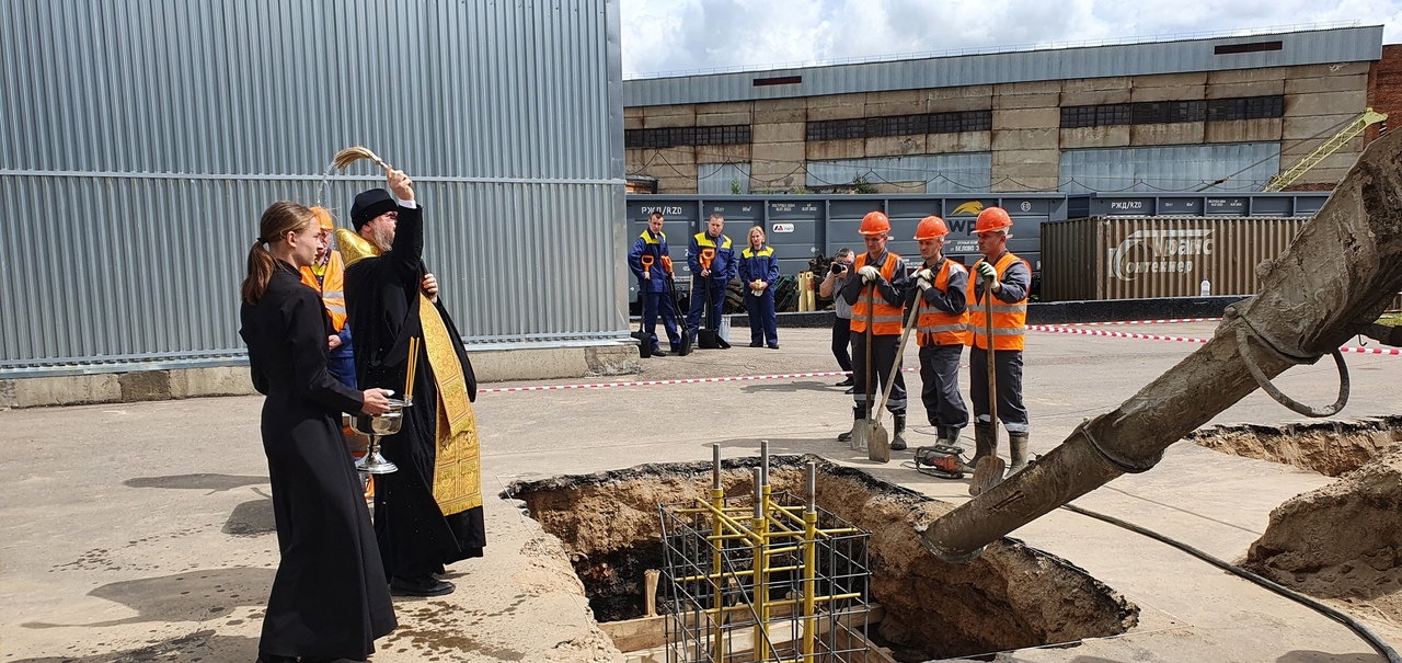 По окончании митинга Его Преосвященство епископ Рославльский и Десногорский Мелетий совершил молебен на месте закладки первого фундамента нового цеха по производству осей колесных пар.