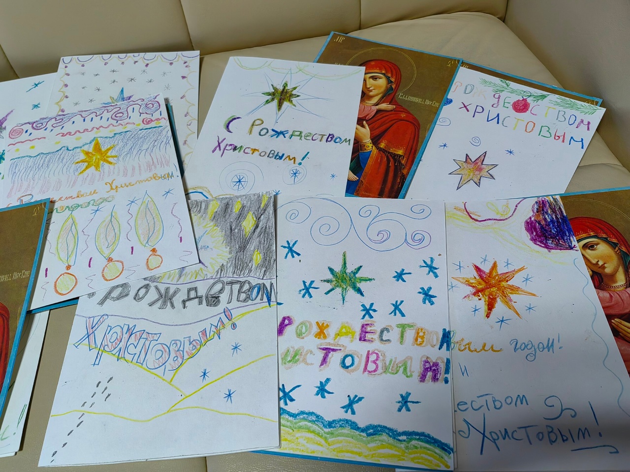 В каждую коробку было вложена Рождественская открытка с поздравлением и теплыми словами от воспитанников Воскресной школы.