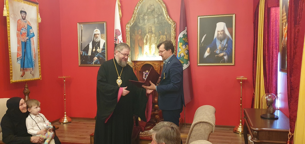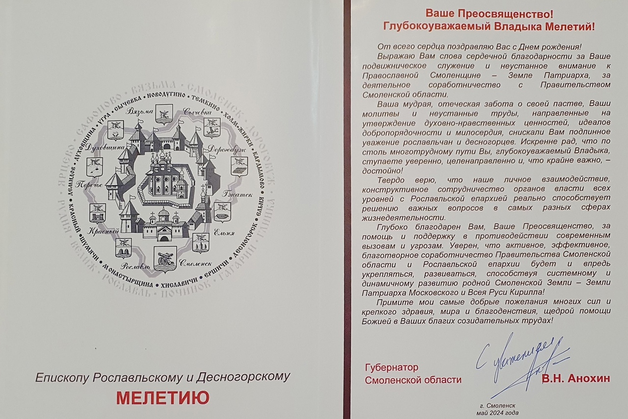 25 мая 2024 г. Липатов Пётр Борисович передал Преосвященному Мелетию поздравления с Днём рождения от Губернатора Смоленской области Василия Николаевича Анохина.
