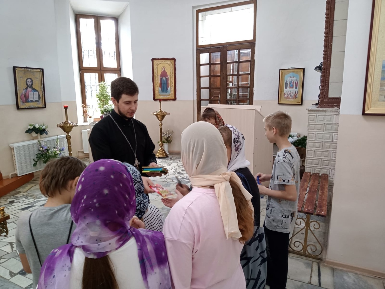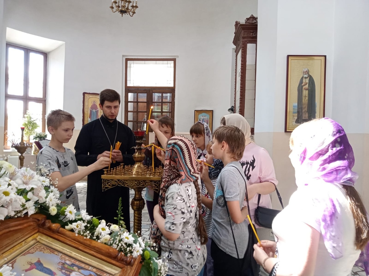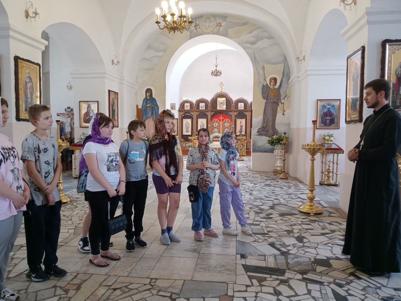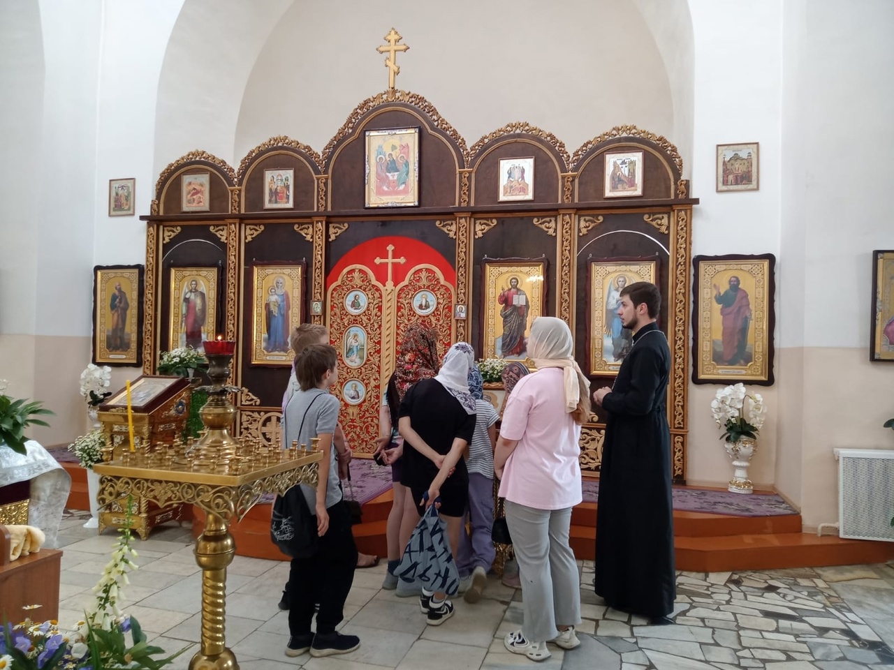 В ходе посещения настоятель храма священник Николай Бондар провел для детей экскурсию по храму, а также рассказал о предстоящем празднике Святой Троицы.