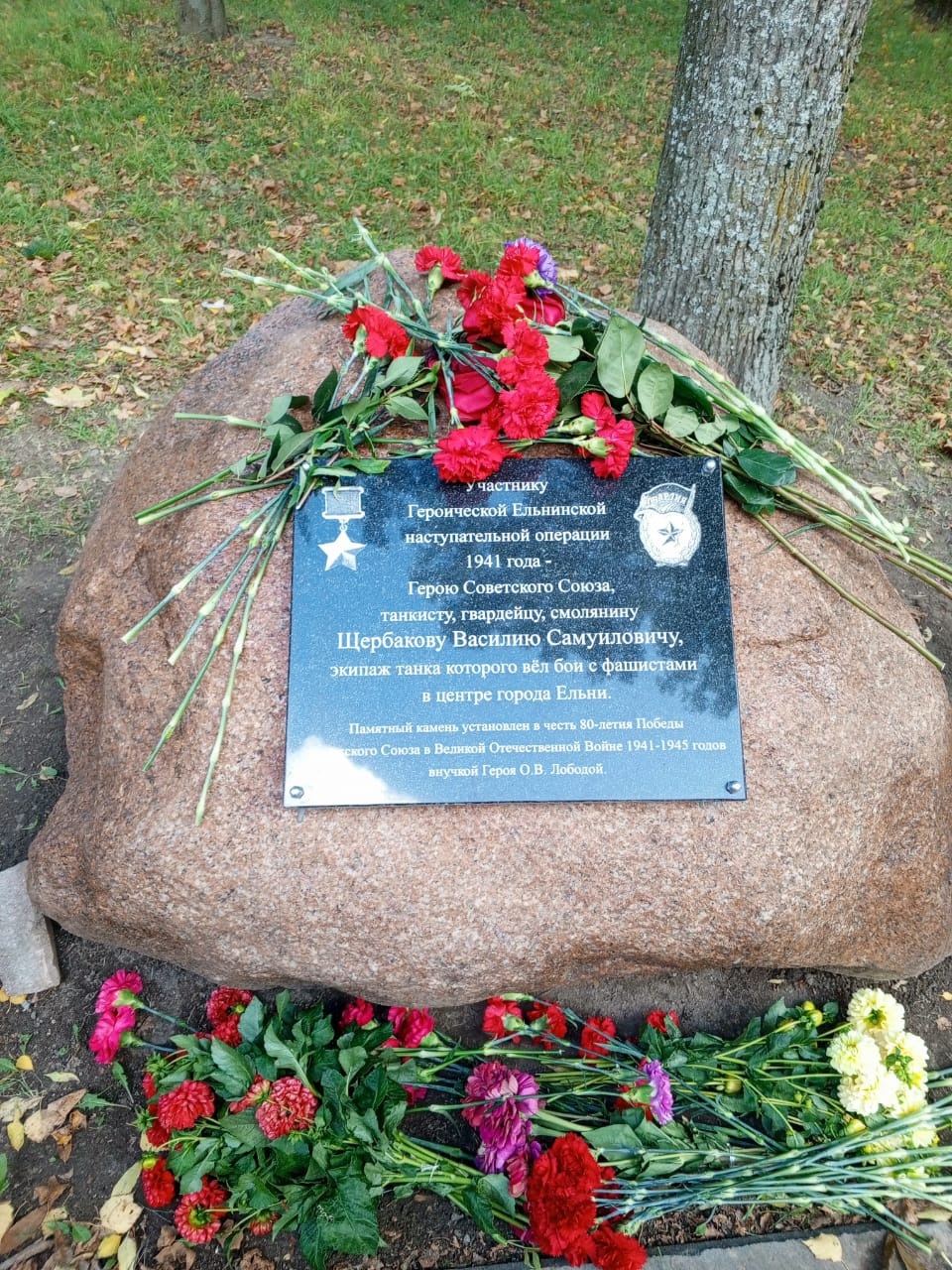 25 сентября 2025 г. в г. Ельня, в сквере боевой славы, состоялось открытие памятного знака герою Советского союза, участнику Ельнинской наступательной операции 1941г., танкисту и гвардейцу, Щербакову Василию Самуиловичу. Памятный камень был установлен внучкой героя О.В.Лободой. В торжественном мероприятии приняли участие; глава администрации Ельнинского муниципального округа Мищенков Н.Д, глава окружного совета депутатов Левченков В.Е, руководитель окружного совета ветеранов Зубов Л.А, полковник в отставке Носарев В.А, настоятель Свято-Ильинского храма иерей Михаил Дмитриев, особыми гостями были члены общественной организации «Боевое братство» г.Бийска Алтайского края, а также учителя и ученики СШ города.