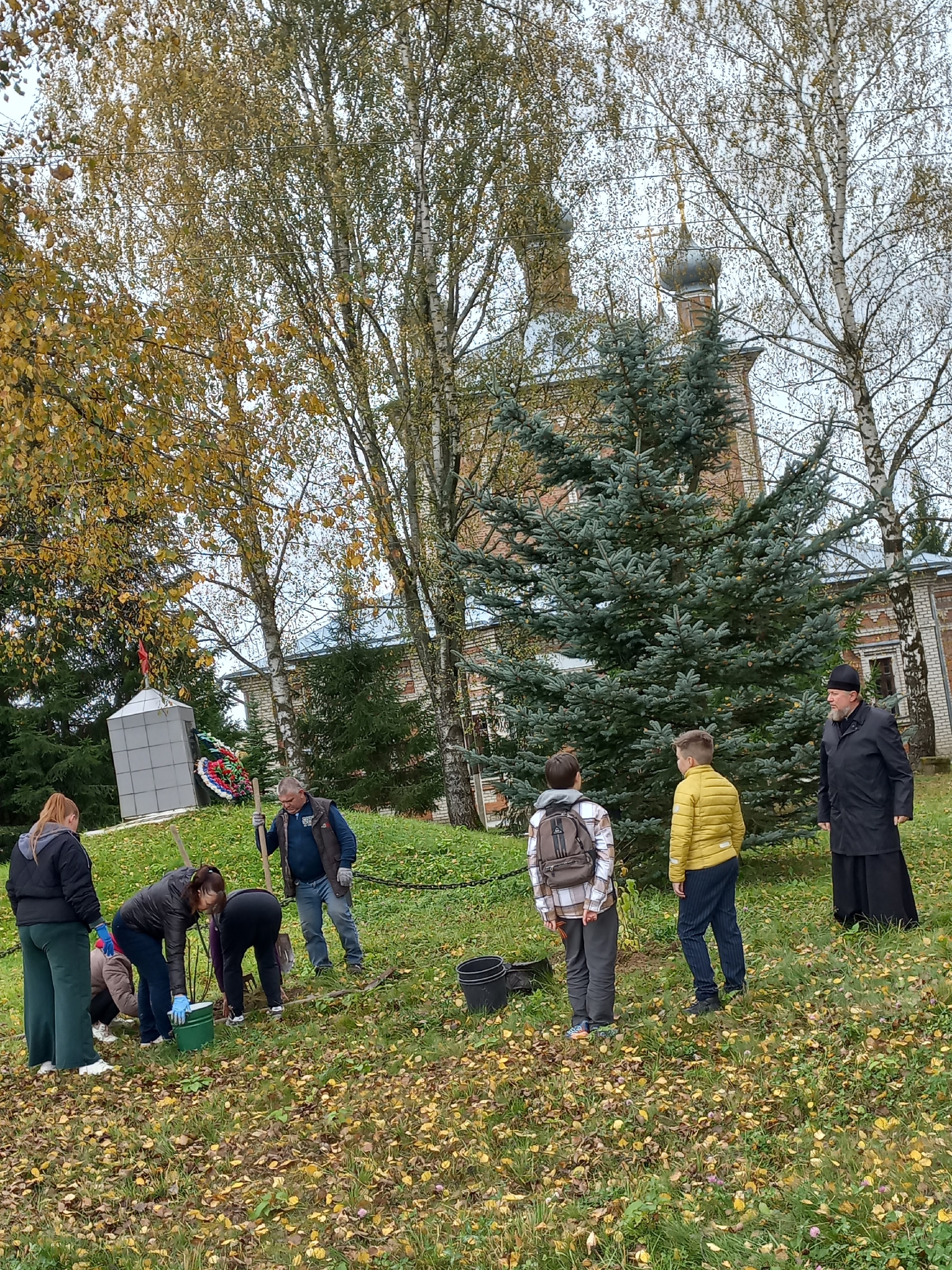 11 октября 2025 года в рамках проекта МБОУ СШ N2 г.Починка «К истокам духовности» преподавателями, школьниками и их родителями на территории храма высажены 45 саженцев деревьев и кустарников.