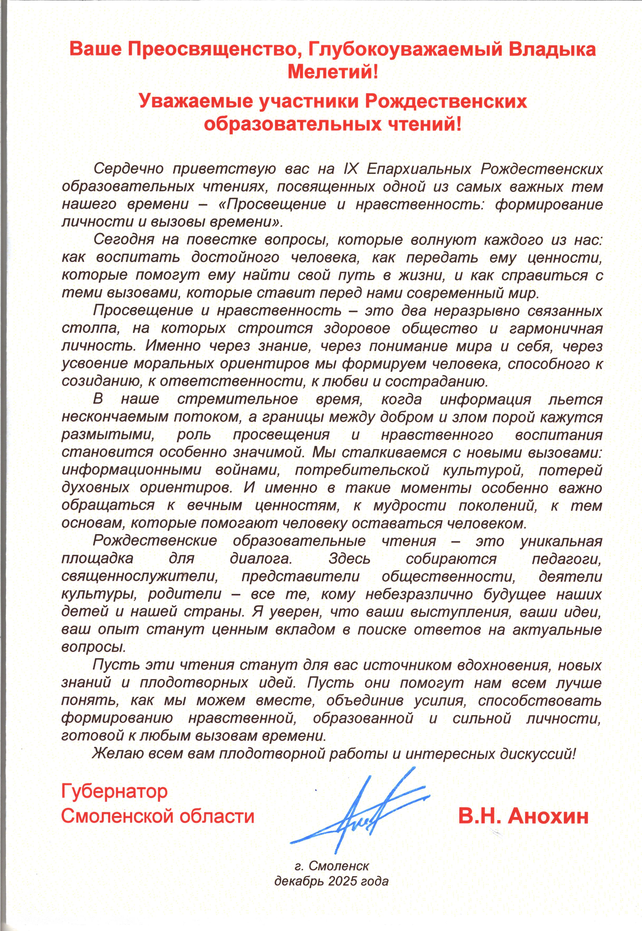 Губернатор Смоленской области Василий Николаевич Анохин направил Приветственное послание участникам IX Рождественских образовательных чтений Рославльской епархии «Просвещение и нравственность: формирование личности и вызовы времени».