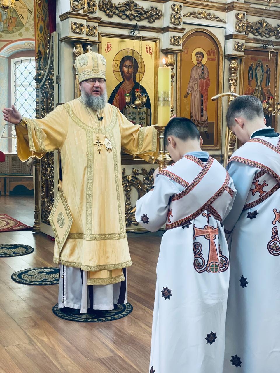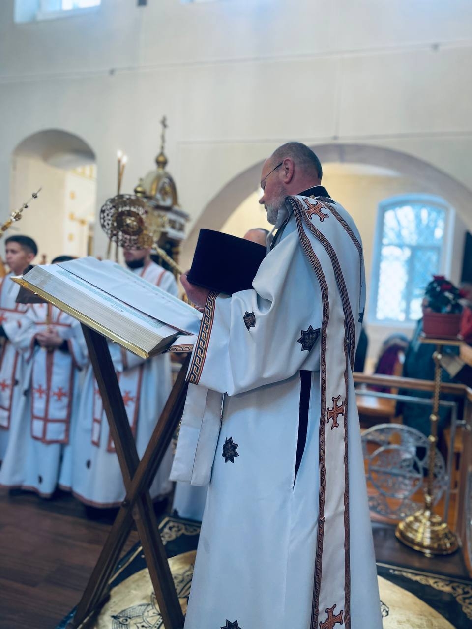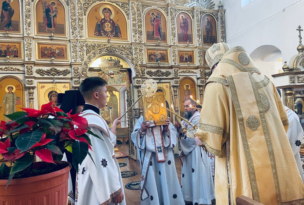 28 декабря 2025 г., в неделю святых праотец, Преосвященный Мелетий совершил Божественную Литургию в Спасо-Преображенском соборе г.Рославля.