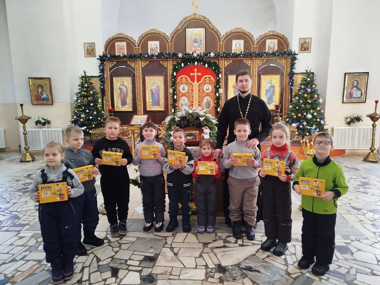 Дети рассказали священнику Рождественские стихи и даже спели праздничную колядку, за что в благодарность от отца Николая получили сладкие Рождественские подарки.