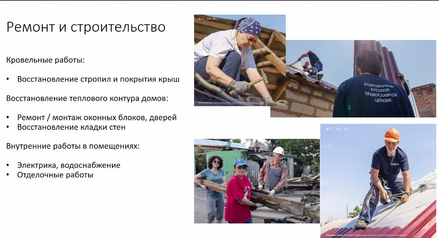 Помочь может каждый неравнодушный человек. В Центрах помощи нужны добровольцы для выдачи продуктов, одежды, средств гигиены, лекарств, детских вещей, оказания юридических, медицинских и психологических консультаций. Добровольцы помогают в уборке, приготовлении пищи, ухаживают за лежачими людьми. В больницах и госпиталях очень важна бытовая и хозяйственная помощь персоналу. Пострадавших очень много. Крайне важна и строительная помощь. Тысячи жителей Донбасса потеряли близких, оказались без помощи в разрушенных домах. Добровольцы-ремонтники восстанавливают крыши, вставляют окна, латают дыры в стенах частных домов, пострадавших от боевых действий. Чтобы стать добровольцем, строительные навыки не требуются – всему научат на месте.