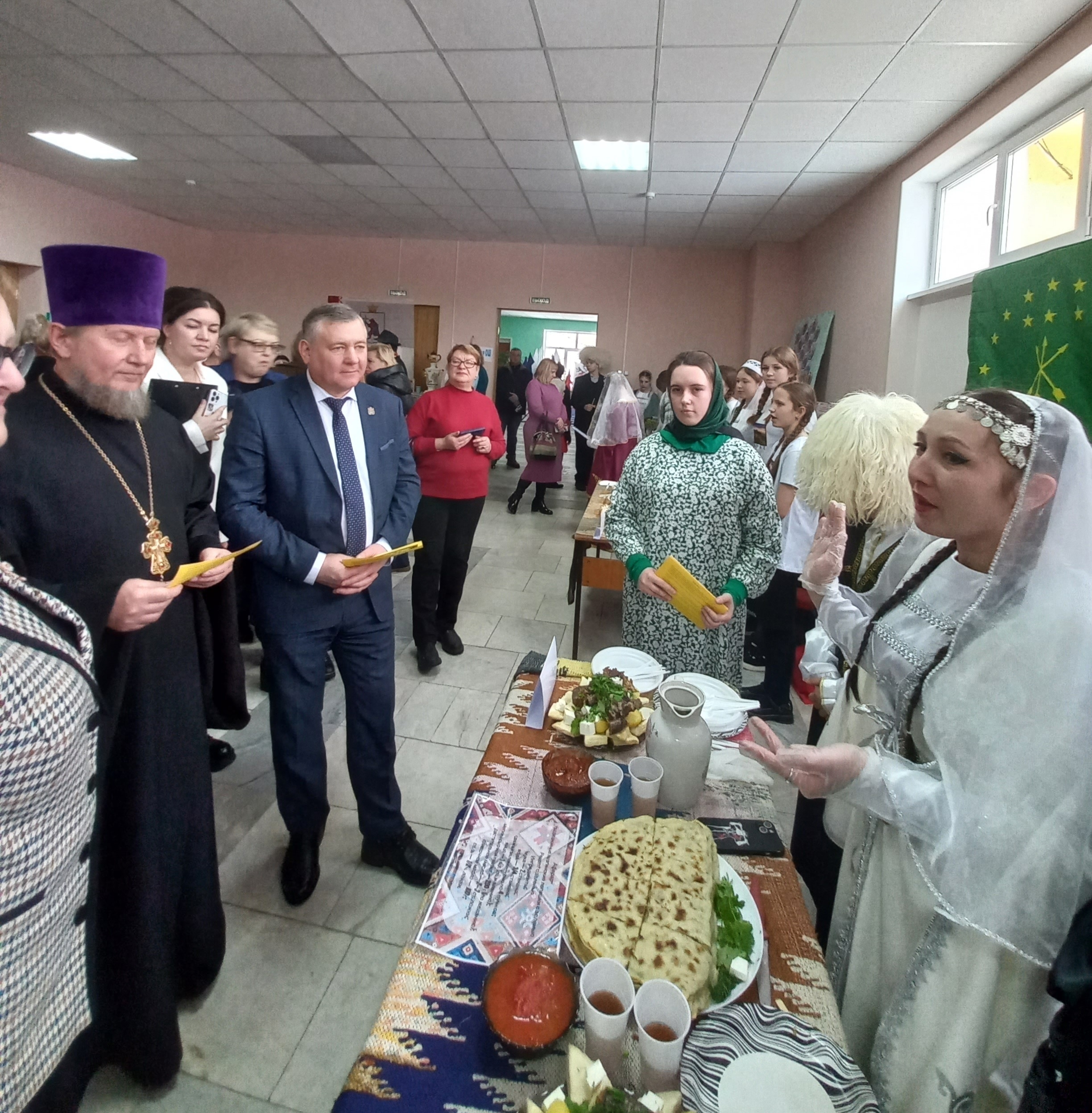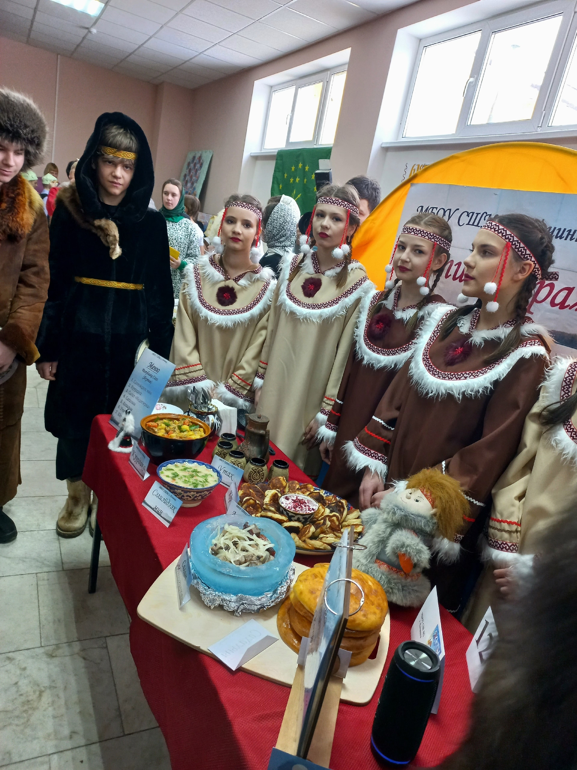 Школьники в народных костюмах рассказали историю народов, их традиции, угостив блюдами народной кухни.