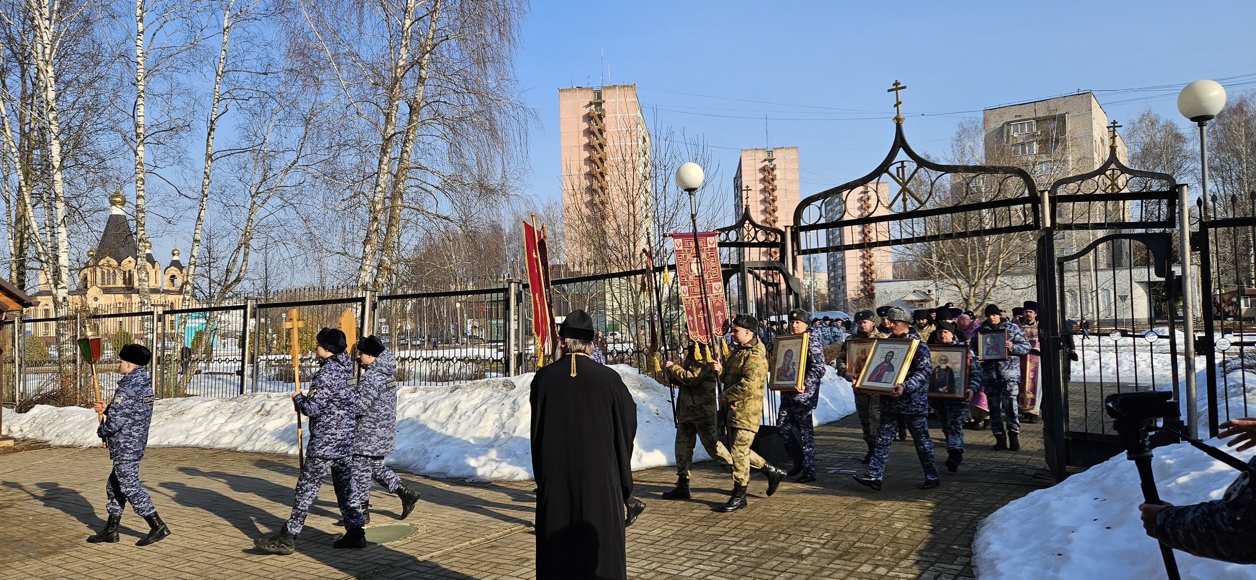 Возглавил шествие генерал-майор полиции Валерий Пчелинцев. Личный состав проследовал к храму подворья Спасо-Преображенского монастыря в честь свт. Стефана Великопермского, держа в руках иконы небесных покровителей Росгвардии.