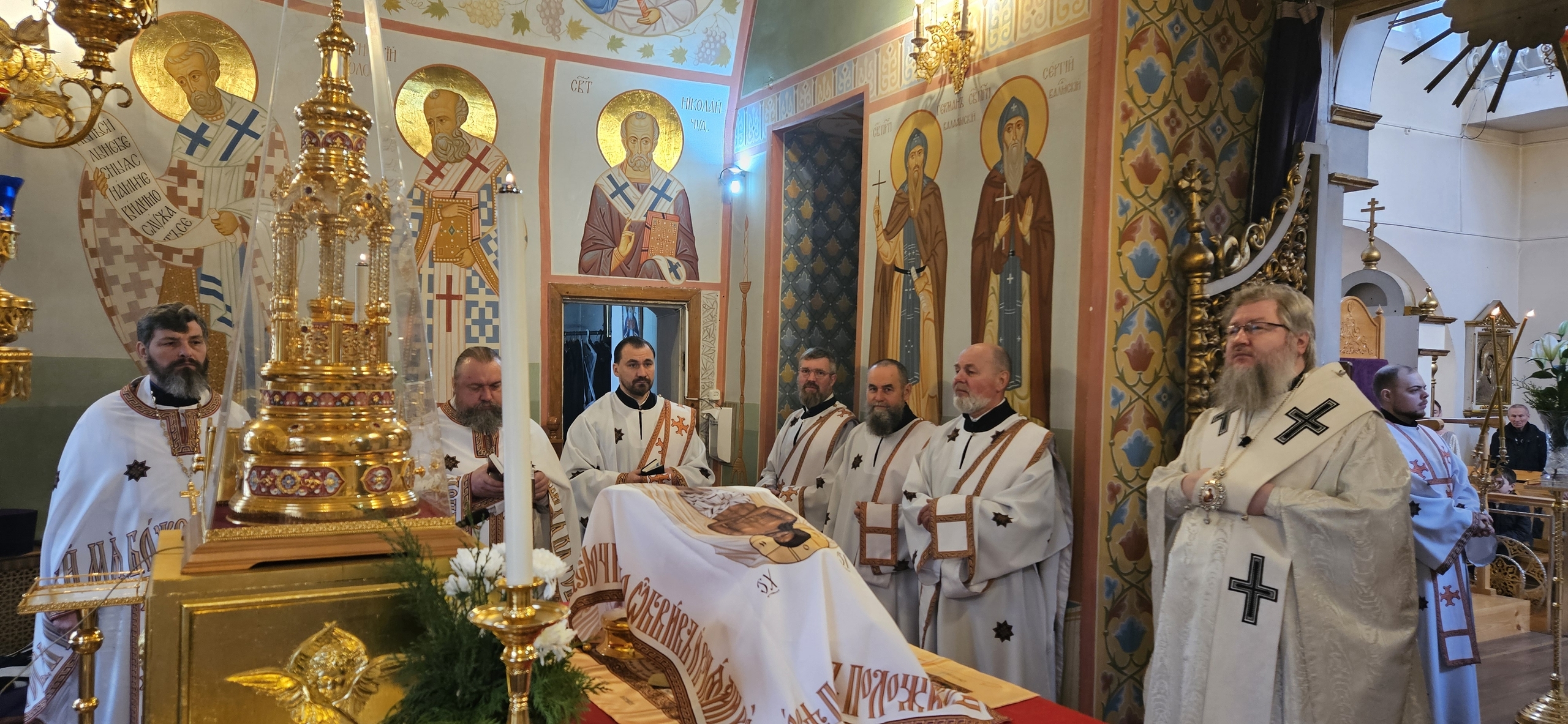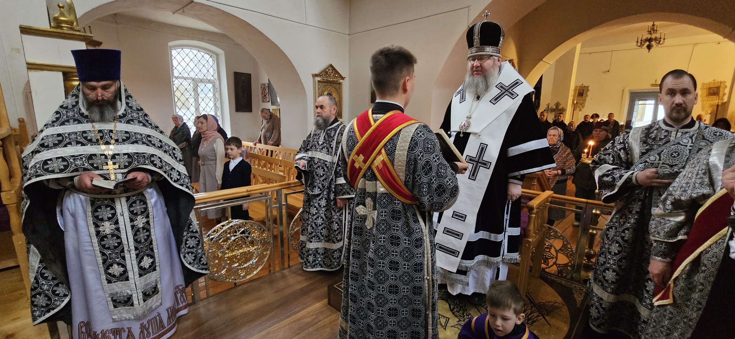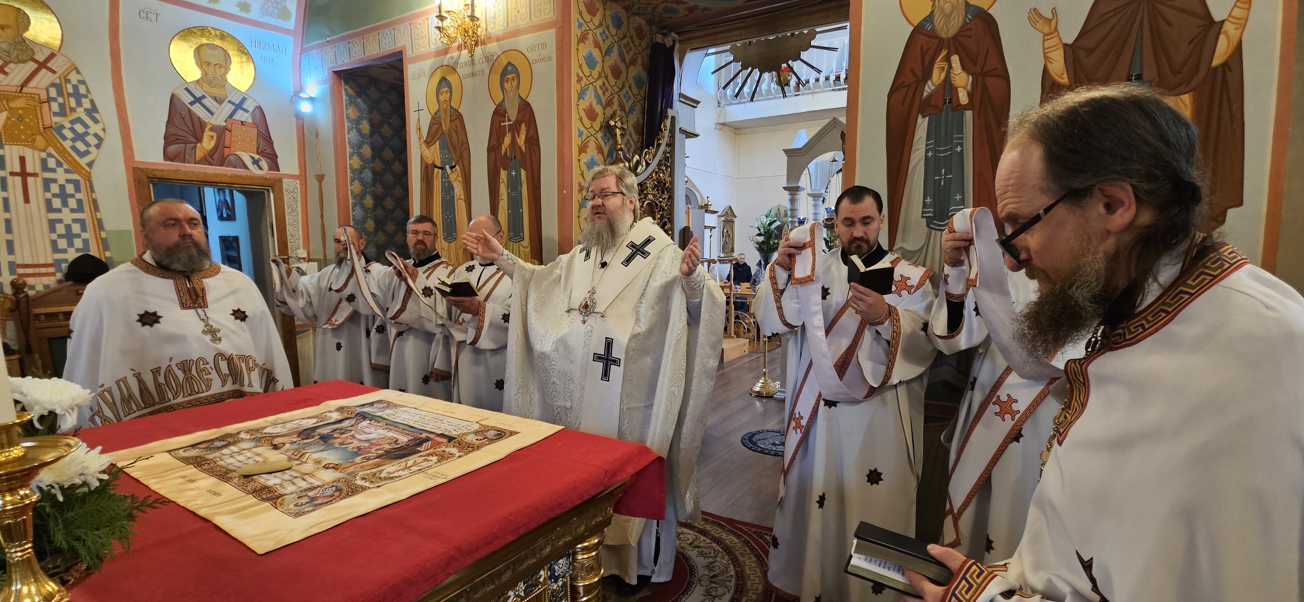 11 апреля 2026 г., в Великую Субботу, Преосвященный Мелетий совершил Вечерню с Литургией св. Василия Великого в Преображенском соборе Спасо — Преображенского мужского монастыря города Рославля.